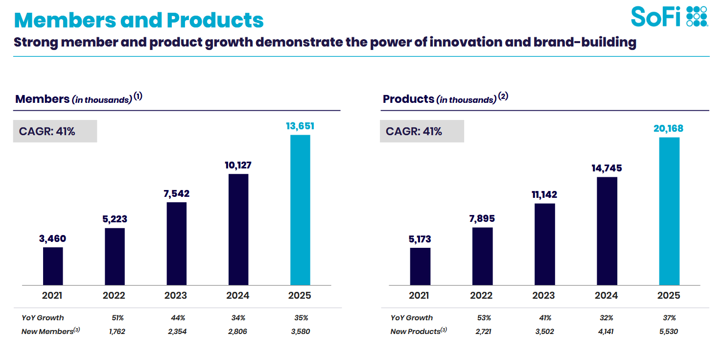 Společnost SoFi zaznamenala ve 4Q rekordní nárůst členů v počtu 1 mil. na celkový počet 13,65 mil. při očekávání 13,52 mil. V meziročním srovnání se jedná o nárůst o 35 % z 10,13 mil. členů ve 4Q roku 2024. Počet poskytnutých produktů ve 4Q mezikvartálně vzrostl o 1,6 mil. na 20,17 mil. V meziročním srovnání se jedná o nárůst o 37 % z 14,75 mil. ze 4Q 2024.