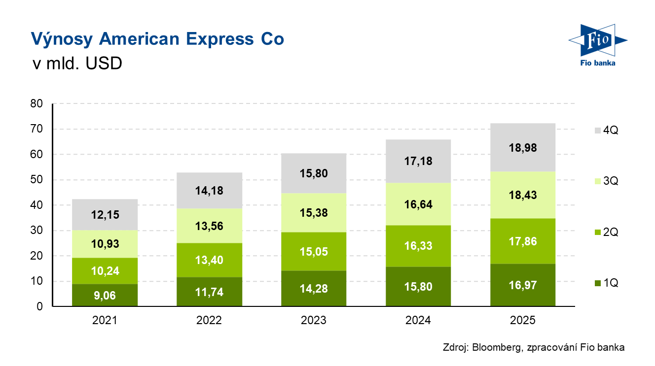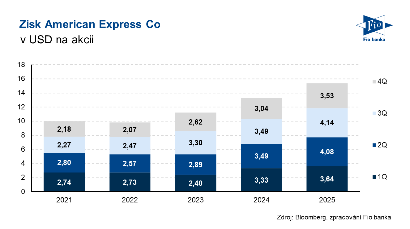 Americká finanční společnost American Express zveřejnila výsledky hospodaření za čtvrté čtvrtletí roku 2025. Jak výnosy, tak zisk na akcii byly zhruba v souladu s odhady analytiků. Společnost zároveň od prvního čtvrtletí roku 2026 zvyšuje čtvrtletní dividendu o 16 % z 0,82 USD na 0,95 USD na akcii.
