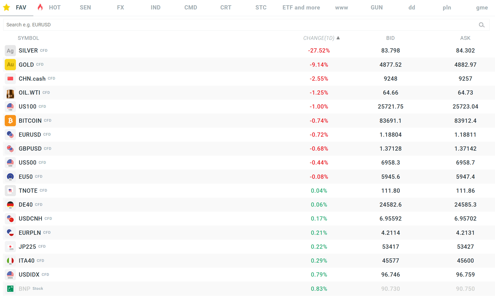 - Zlato a stříbro zažívají bezprecedentní propady a uzavírají nejhorší den své moderní obchodní historie. Zlato již ztratilo více než 10,5 % své hodnoty. Stříbro dopadá ještě hůře – propadá se až o 30 % na 76,5 USD/unci, což je nejhorší denní výsledek v procentuálním vyjádření v historii obchodování s touto komoditou, čímž překonává i slavný krach bratrů Huntových z 80. let.