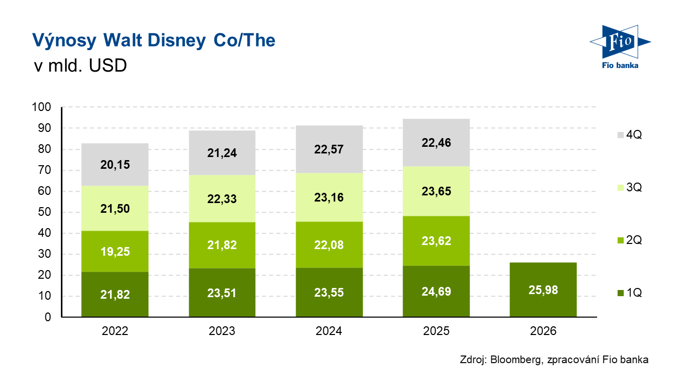 Zábavní a mediální společnost Walt Disney oznámila výsledky hospodaření za první čtvrtletí fiskálního roku 2025, které skončilo 27. prosince 2025. Jak výnosy, které meziročně vzrostly o 5,2 % na 25,98 mld. USD, tak i očištěný zisk na akcii překonaly odhady analytiků.