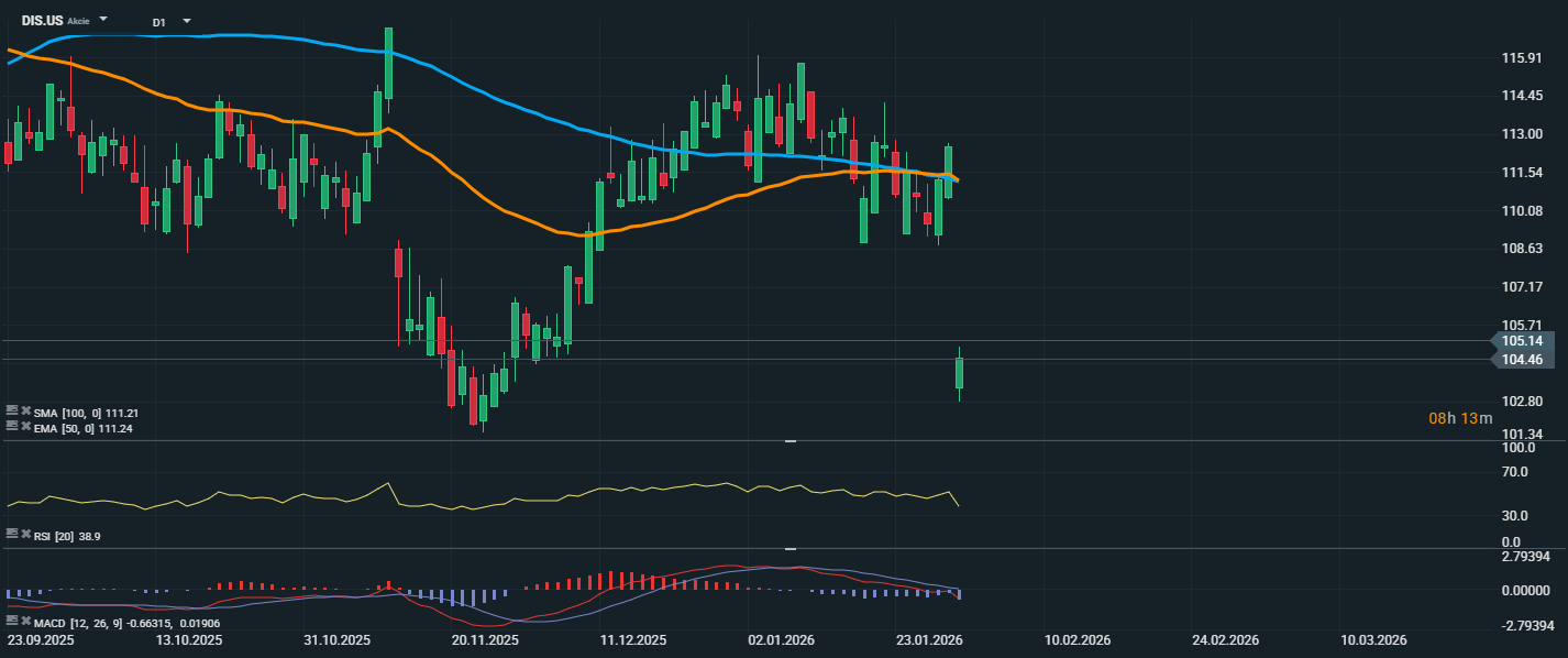 Akcie společnosti Walt Disney se aktuálně obchodují na ceně 105,14 USD a cena zůstává pod klouzavými průměry EMA 50 (111,24 USD) a SMA 100 (111,21 USD). RSI se nachází na hodnotě 38,9, tedy stále v oblasti slabého momenta, ale s náznakem, že se trh odráží z přeprodaného pásma. Z technického hlediska bude klíčové, zda se cena dokáže udržet nad úrovní 105 USD a případně znovu otestovat oblast kolem EMA 50. Bez trvalého návratu nad 111 USD však nelze hovořit o změně trendu.