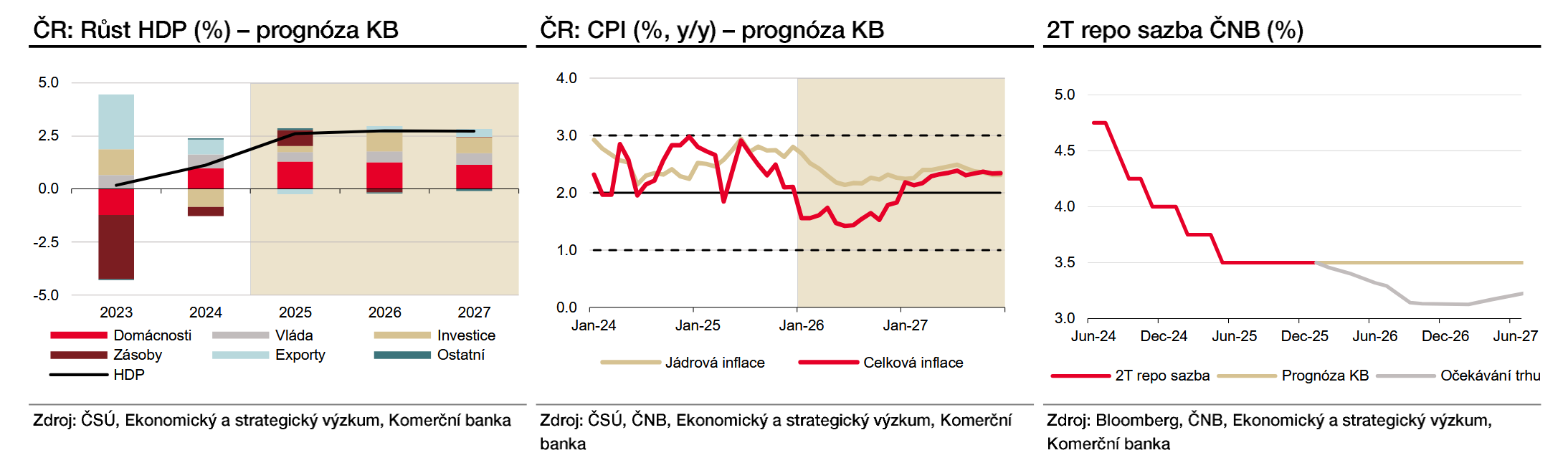Česká ekonomika vstupuje do roku 2026 ve výrazně lepší kondici, než jsme ještě před čtvrt rokem přepokládali. V aktualizované makroekonomické prognóze jsme odhad letošního růstu HDP zvýšili na 2,7 % z původních 1,6 %. K výrazné vzestupné revizi nás přiměla překvapivě silná druhá polovina loňského roku, během níž hospodářství rostlo nejrychleji za poslední tři roky. Oživení pomohla vzhledem k celním válkám a nevýkonnému německému průmyslu poněkud překvapivě i zahraniční poptávka, prim ale hrála ta domácí – spotřeba domácností se díky růstu reálných mezd vrátila na předpandemické úrovně, a to o půl roku dříve, než jsme předpokládali.
