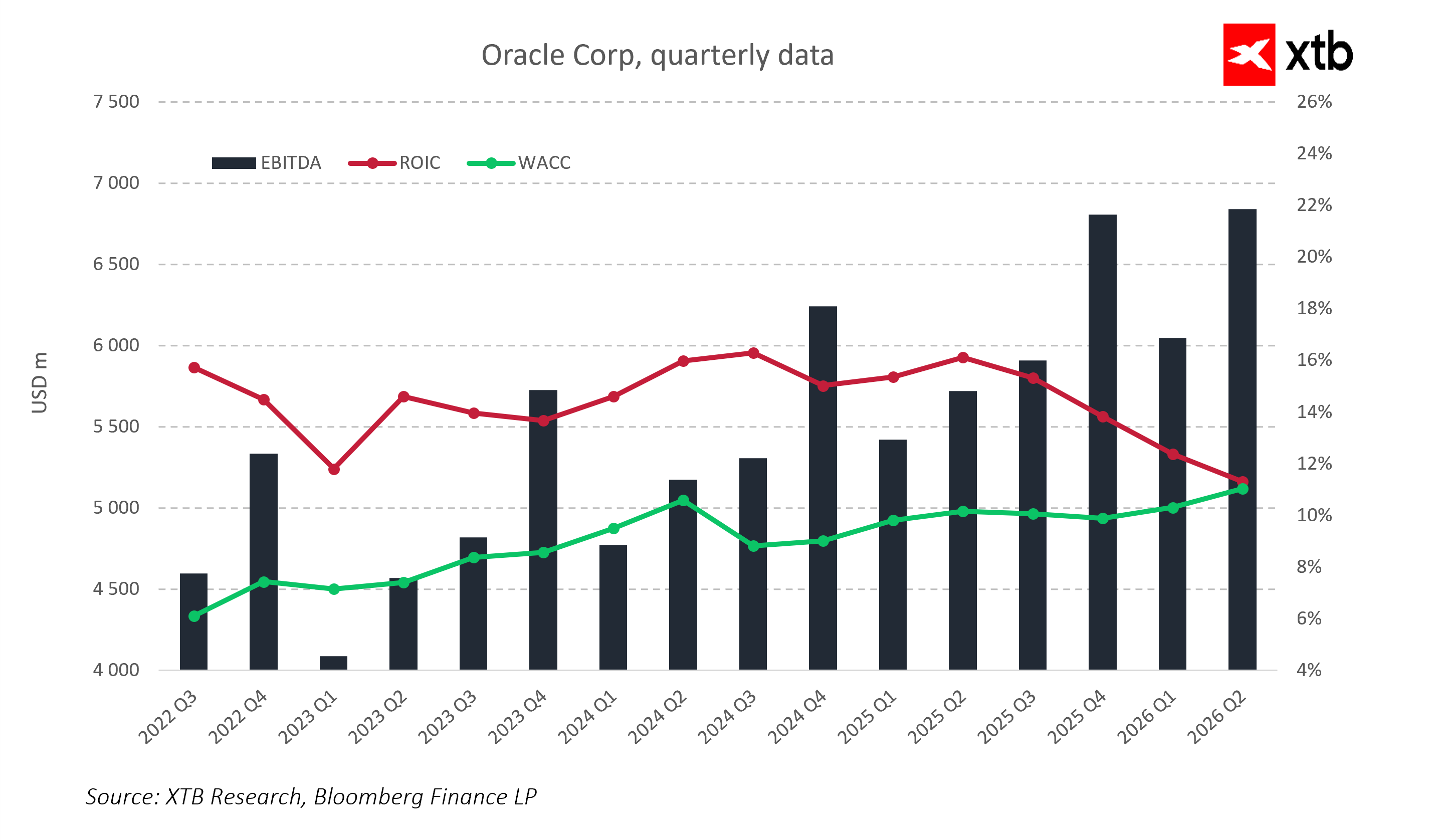 Data ukazují systematický růst EBITDA, což potvrzuje rostoucí rozsah provozních aktivit Oraclu. Zároveň ROIC se postupně přibližuje hodnotám WACC, což naznačuje zužující se rozdíl mezi výnosem z investovaného kapitálu a náklady na kapitál. Tato dynamika zvyšuje citlivost společnosti na další růst dluhu a rostoucí náklady na financování, i přes zlepšující se provozní výkonnost.