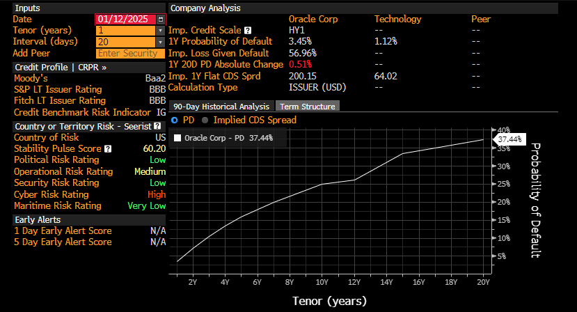 Aktuální úvěrové ratingy Oraclu (BBB / Baa2) řadí společnost na spodní hranici investičního stupně. Odhadovaná pravděpodobnost platební neschopnosti během 20 let činí přibližně 37 %, což naznačuje, že riziko finanční tísně v případě dalšího navyšování dluhu je relativně vysoké.