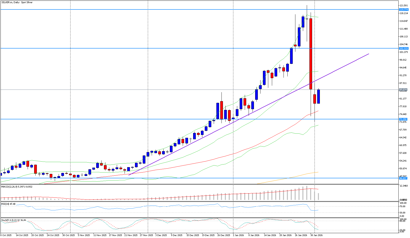 Stříbro se po mimořádně prudkém pátečním výprodeji stabilizuje a aktuálně se obchoduje v bočním pásmu kolem úrovně 85,00. Páteční pokles dosáhl přibližně 27 %, přičemž cena nalezla dočasnou podporu poblíž 50denního jednoduchého klouzavého průměru na úrovni 75,00. Tento pohyb znamenal zásadní technické poškození trhu, jelikož stříbro zároveň prorazilo jak převládající vzestupnou trendovou linii vedenou od listopadu, tak i 20denní SMA, které dříve fungovaly jako dynamická podpora. Za prudkým oslabením stojí kombinace fundamentálních faktorů. Klíčovým impulzem bylo jmenování Kevina Warshe do čela Fedu, což posílilo jestřábí očekávání ohledně měnové politiky a vedlo k růstu reálných výnosů. Současně došlo k ústupu poptávky po bezpečných aktivech poté, co jednání mezi USA a Íránem naznačila určitý posun směrem ke zmírnění napětí. Tento mix faktorů výrazně oslabil zájem investorů o drahé kovy a spustil masivní likvidaci dlouhých pozic. Technický obraz nyní jednoznačně favorizuje medvědí scénář. RSI se prudce propadl pod neutrální hranici 50, což potvrzuje ztrátu býčí kontroly nad trhem. Stochastický oscilátor rovněž klesá směrem k přeprodaným hodnotám, aniž by zatím vykazoval známky stabilizace. Bollingerova pásma se výrazně rozšířila, což odráží extrémní nárůst volatility a zvýšenou nejistotu ohledně krátkodobého vývoje. Pokud bude prodejní tlak pokračovat, stříbro by mohlo znovu otestovat oblast 70,00 až 75,00, kde se nachází nejen 50denní SMA, ale také spodní Bollingerovo pásmo. Průraz pod tuto zónu by otevřel prostor pro hlubší pokles směrem k oblasti kolem 60,00, kde leží 100denní klouzavý průměr. Naopak případný korekční odraz by mohl narazit na první silnější odpor v pásmu 90,00 až 93,00, kde se nyní sbíhá 20denní SMA s prolomenou trendovou linií. Ještě výše by výraznou bariéru představovala psychologická hladina 100,00. Celkově však stříbro zůstává po prudkém výprodeji v defenzivě a dokud technické indikátory nezačnou signalizovat stabilizaci, převažují rizika dalšího oslabení.