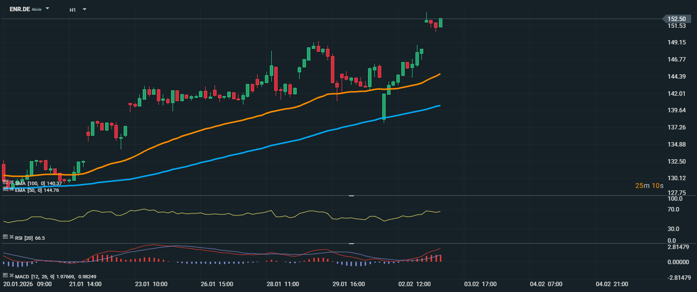 Akcie společnosti Siemens Energy (ENR.DE) se nachází ve výrazném růstovém trendu, kdy po krátkodobé korekci prorazily směrem vzhůru a dosáhly úrovně 152,50 EUR. Cena se nyní drží nad oběma sledovanými klouzavými průměry – EMA 50 (144,76 EUR) i SMA 100 (140,37 EUR), což potvrzuje býčí technické nastavení. RSI se nachází na hodnotě 66,5, čímž se přibližuje překoupené zóně, ale zatím stále ponechává prostor pro další růst bez výraznějšího rizika obratu.
