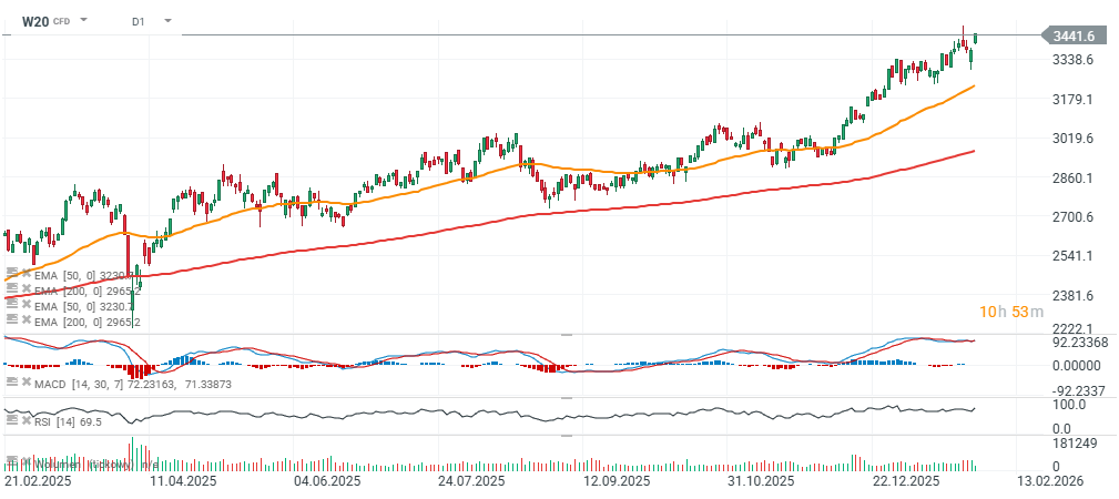 Futures kontrakt na WIG20 (W20) je dnes nejvýkonnějším benchmarkem v Evropě, když vystoupal nad 3 440 bodů a zaznamenává denní zisk 2 %. Klíčovou rezistenční zónou zůstává psychologicky důležitá hladina 3 500 bodů. Index je meziročně silnější o téměř 44 %.