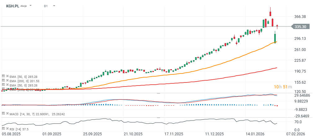 Akcie KGHM (KGH.PL) těží z oživení cen stříbra a mědi, když vzrostly o více než 20 % od lokálního minima a aktuálně se obchodují zhruba 15 % pod historickým maximem.