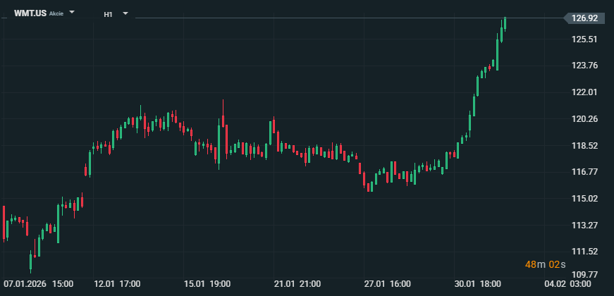 Akcie Walmartu se během dne obchodovaly nad úrovní 126 USD, což stačilo k tomu, aby společnost dosáhla této rekordní tržní kapitalizace. Investoři ocenili stabilní růst tržeb, efektivní řízení nákladů i úspěšnou digitální transformaci. Zdroj: xStation5