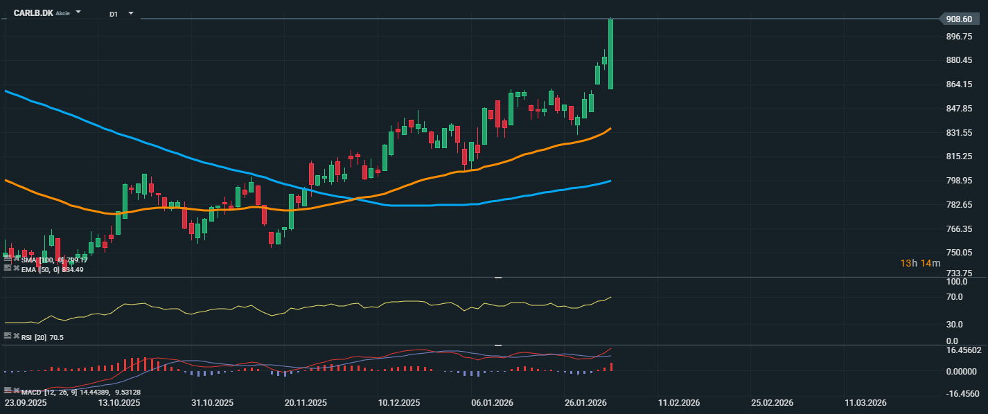 Akcie Carlsbergu dnes výrazně posílily a aktuálně se obchodují na úrovni 908,60 DKK, což představuje prudký růst nad předchozí cenová maxima. Z technického pohledu se akcie nachází v silném býčím trendu. Cena je výrazně nad klouzavými průměry – EMA 50 na úrovni 834,49 DKK a SMA 100 na 799,17 DKK. Oba průměry mají rostoucí sklon, což potvrzuje tržní sílu a zvyšující se dynamiku. RSI se nachází na úrovni 70,5, čímž vstoupil do pásma překoupenosti. To může naznačovat krátkodobé vyčerpání růstu, avšak v rámci silného trendu bývá tento signál často ignorován až do potvrzení obratu. Případná korekce by mohla narazit na první technickou podporu kolem 850–860 DKK, tedy v blízkosti předchozích maxim a současně na dohled klouzavého průměru EMA 50.