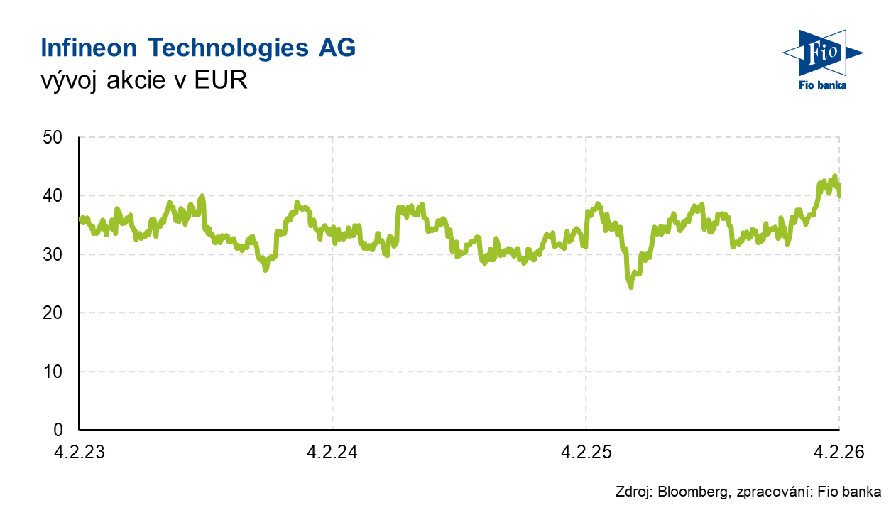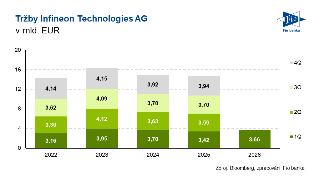 Klíčová slova: Analytik | Poptávka | Akcie | Akvizice | Bloomberg | CEO | Dividendový výnos | Investice | Marže | P/E | Portfolio | Ukazatel | Výnos | Zisk na akcii | Analytici | EUR | Zisk | Výsledky | EPS | Banka | Fio banka | Cena | Fio | Cílová cena | EBITDA | Hrubá marže | ROCE | Tržby | Citi | Tempo růstu | Kapitalizace | Výhled | Konsensus | Konsenzus | Očekávání | Infineon | Infineon Technologies | AMS | iFX | Čistý zisk | Generální ředitel | Celkový zisk | Ziskovost | Pokles | Meziroční růst | FCF | Vývoj | Tržby společnosti | Růst | Potenciál | Ocenění | Růst tržeb | Konsensus trhu | AI | Divize | Společnosti | Automotive | Společnost | Výsledky společnosti | Celoroční výhled | 3М | IFX | Budoucí potenciál | ProCent | Očištěný zisk na akcii | Fio banka, a.s. | Potenciál růstu | Michal Bárta | Datová centra | Mírný růst | Volné hotovostní toky | Hotovostní toky |