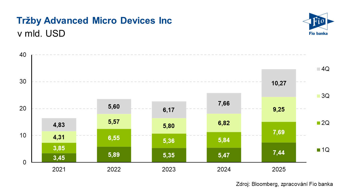 Americká technologická společnost AMD, která navrhuje čipy, zveřejnila výsledky hospodaření za čtvrtý kvartál roku 2025. Tržby i očištěný zisk na akcii překonaly očekávání. Přestože výhled pro 1Q byl nad odhady, tak se někteří analytici domnívají, že investoři očekávali více.
