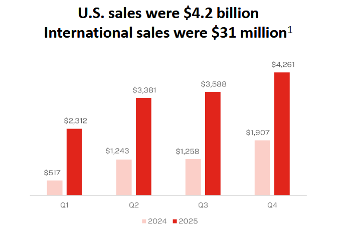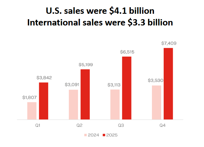 Tržby ve Spojených státech meziročně vzrostly o 43 % na 12,88 mld. USD, a to díky 50% nárůstu objemu, což bylo částečně kompenzováno 7% poklesem v důsledku nižších realizovaných cen. Tržby mimo Spojené státy zaznamenaly meziroční růst také o 43 % na 6,41 mld. USD.