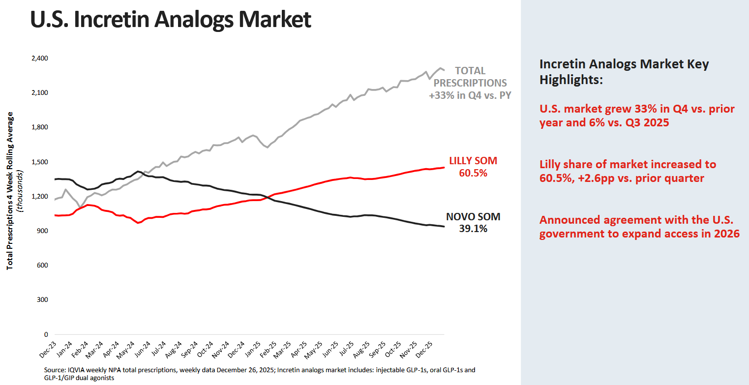 Analytik Evan David Seigerman z BMO Capital Markets uvedl, že silná čísla a výhled na rok 2026, který překonal konsensus, umlčí pesimisty. Poznamenává, že síla výsledků byla tažena pokračujícím skvělým výkonem inkretinové divize (léky na bázi GLP-1), čímž se Eli Lilly jednoznačně dostává do vedení před konkurenční Novo Nordisk. Dodává, že uvedení léku orforglipron zůstává v plánu na 2Q, přičemž analytik vidí pozitivní signály vycházející ze silného startu prodeje pilulkové verze léku Wegovy.
