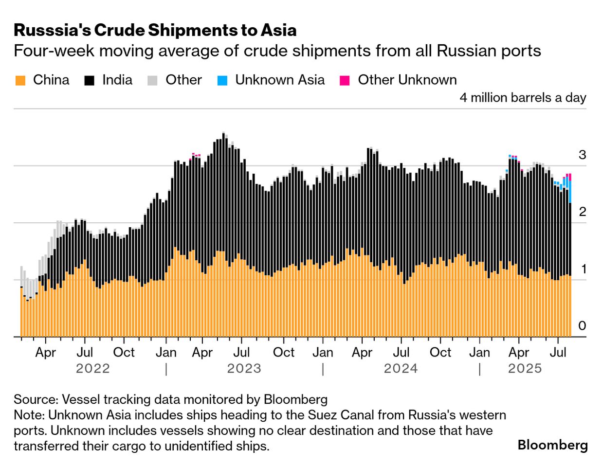 Vývoz ruské ropy do Indie se od začátku března 2022 kvůli sankcím zvýšil. Průměrný denní objem nákupů ruské ropy v Indii činí 360 000 barelů denně. Tento objem je čtyřnásobkem denního objemu nakoupeného v loňském roce. -