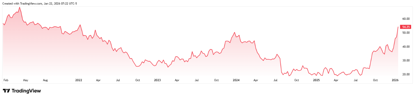 Hodnota akcií společnosti Intel ve středu 21. 1. 2026 vzrostla o 11 procent a uzavřela nad klíčovou technickou hranicí 54 USD. Pro investory, kteří mají Intel ve svých portfoliích, jde o mimořádně důležitý moment, protože se jedná o nejvyšší cenu od ledna 2022. Stejně příznivý je i širší kontext, jelikož za posledních 12 měsíců si akcie připsaly téměř 150 procent a jen za rok 2025 vzrostly o více než 80 procent.