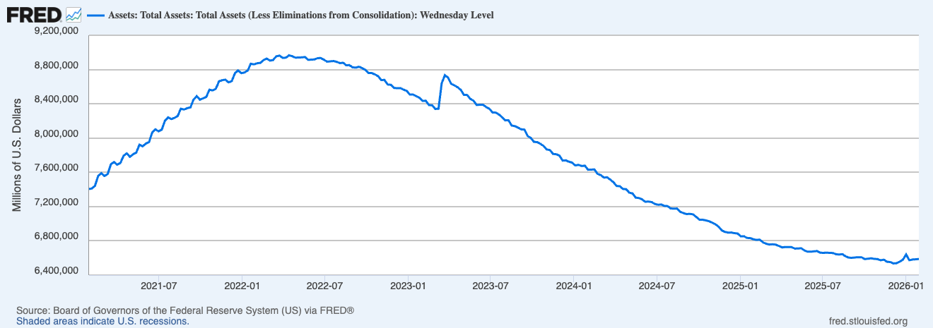 Fed v letech 2023 až 2025 důsledně snižoval svou rozvahu (celková aktiva) a na konci loňského roku ukončil kvantitativní zpřísňování (QT). Kevin Warsh však může lobovat za další snižování rozvahy, což by mohlo omezit likviditu. Zdroj: Fed St. Louis