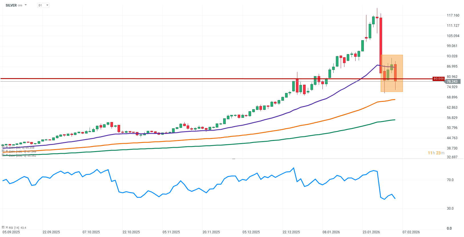 Cena stříbra dnes klesla o více než 5 % a dnes je na komoditním trhu pod extrémním tlakem. Včera cena stříbra vzrostla o více než 10 % a dosáhla nejvyšší úrovně od roku 2013. Včerejší zisky na stříbru se připisují hlavně retailovým investorům z Redditu, kteří masivně vstupovali do long pozic. Trh se stříbrem je však mnohonásobně větší, než jakým je jedna akciová společnost typu GameStop nebo ACM, takže k výraznějšímu pohybu je potřeba více kapitálu. -