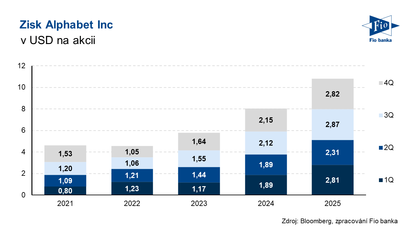 Klíčová slova: USA | Akcie | Bloomberg | CEO | Dividenda | Dividendový výnos | Investice | Marže | P/E | Ukazatel | Výnos | Wall Street | Zisk na akcii | Analytici | Banky | USD | Investoři | Zisk | Výsledky | Obchodovat | Investovat | EPS | Banka | Fio banka | Cena | Fio | Investiční | Investing | Ocenění akcií | Odkup akcií | Sázky | Trh | Cílová cena | Provozní marže | ROCE | Využití kapacit | Jefferies | Evercore ISI | Investing.com | Úspěch | Podnikání | Pokles výnosů | Kapitalizace | Výhled | Konsensus | Výnosy | Očekávání analytiků | Alphabet | Očekávání | NEST | Zpětný odkup akcií | Konglomerát | Kapitálové výdaje | Očekávání trhu | GOOGL | Čistý zisk | Objem | Generální ředitel | Ztráta | Hospodaření | Výsledky hospodaření | Google | Pokles | Provozní zisk | Meziroční růst | Zlepšení | Akcie Alphabet | Výdaje | FCF | Vývoj | Růst | Alphabet (GOOGL) | Umělá inteligence | Růst výnosů | Expanze | ONE | Waymo | Představenstvo | Ocenění | Sundar Pichai | Fitbit | Konsensus trhu | API | Příležitosti | AI | Google Play | Společnosti | Gemini | Společnost | Výsledky společnosti | 3М | Vital Knowledge | Vice | Evercore | Společnost Alphabet | Škálování | Platforms | Výhody | Konglomerát Alphabet | Akcie třídy | Fio banka, a.s. | Investice do AI | Rok 2025 | Michal Bárta | Odměny | Náklady | Google Cloud | YouTube | Truist Securities | Volné hotovostní toky | Hotovostní toky | Other Bets | Autonomní vozidla |