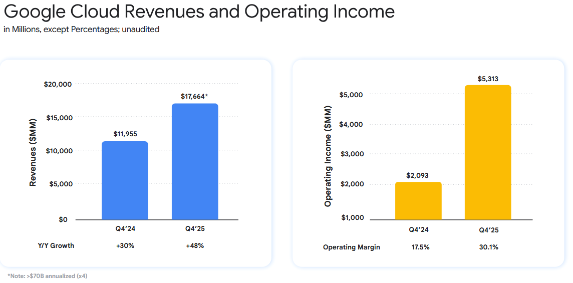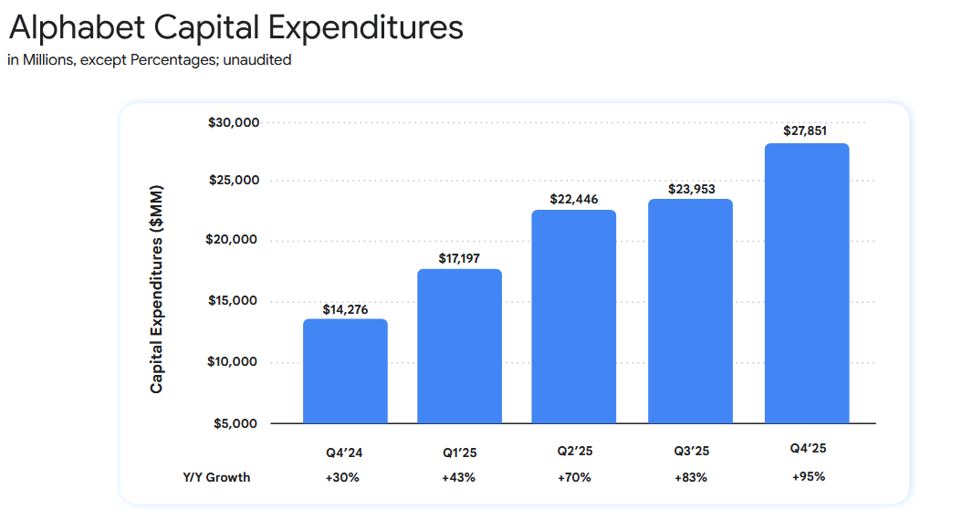 Technologický konglomerát Alphabet zveřejnil své výsledky hospodaření za čtvrtý kvartál roku 2025. Výsledky překonaly konsensus trhu. Růst segmentu Google Cloud zrychlil na 48 % meziročně, což překonalo veškerá očekávání. Z důvodu obrovského úspěchu a zájmu o AI (nezpracované zakázky v Google Cloud vzrostly mezikvartálně o 55 % na 240 mld. USD), plánuje společnost v tomto roce investovat astronomických 175 až 185 mld. USD do kapitálových výdajů. Wall Street očekávala pouze 119,5 mld. USD.