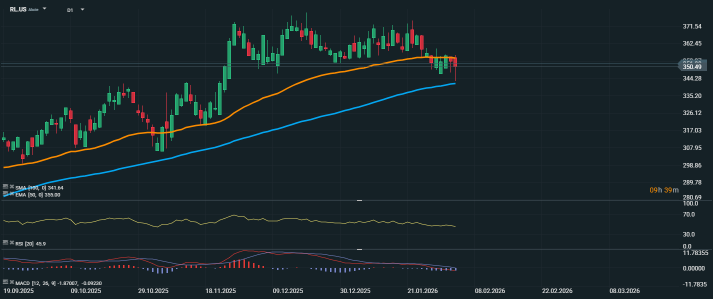 Akcie módní společnosti Ralph Lauren se aktuálně obchodují na ceně 350,49 USD a po předchozím poklesu se snaží stabilizovat v okolí dvou důležitých technických úrovní – EMA 50 na úrovni 355,00 USD a SMA 100 na 341,64 USD. Cena se přitom v posledních dnech pohybuje těsně mezi těmito průměry, což značí nerozhodnost trhu a možnou změnu trendu. RSI osciluje kolem hodnoty 45,9, tedy pod neutrální hladinou, což signalizuje mírný prodejní tlak, ale zároveň prostor pro obrat. Pokud se akcie udrží nad SMA 100 (341,64 USD), může to poskytnout podporu pro další odraz vzhůru. Naopak prolomení této úrovně by mohlo otevřít prostor pro další pokles směrem k 330–320 USD. K pozitivnímu signálu by došlo až při návratu nad EMA 50 (355 USD), čímž by byl zpochybněn aktuální sestupný trend.