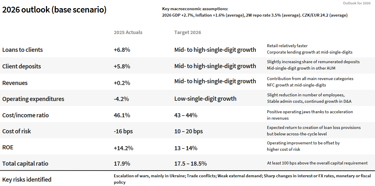 Klientské úvěry, vklady a výnosy by mělyrůst v řádu středních až vyšších jednotek procent. Provozní náklady by měly vzrůst o nižší jednotky procent. Management dále očekává, že náklady na riziko se budou pohybovat v rozmezí 10-20 bazických bodů a návratnost kapitálu mezi 13-14 %.