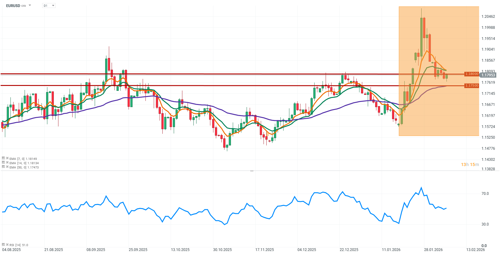 Měnový pár EUR/USD se aktuálně obchoduje kolem úrovně 1,17953. Trh vykazuje mírnou volatilitu v reakci na nejnovější makroekonomická data z Evropy i aktualizace z amerického trhu práce. Pár se stáhl z nedávných lokálních maxim, protože impulzy plynoucí z průmyslových dat a signálů ECB byly příliš slabé na to, aby udržely předchozí růstovou dynamiku. Investoři zůstávají opatrní a sledují jak risk-off sentiment, tak očekávání ohledně rozhodování nového šéfa Fedu.