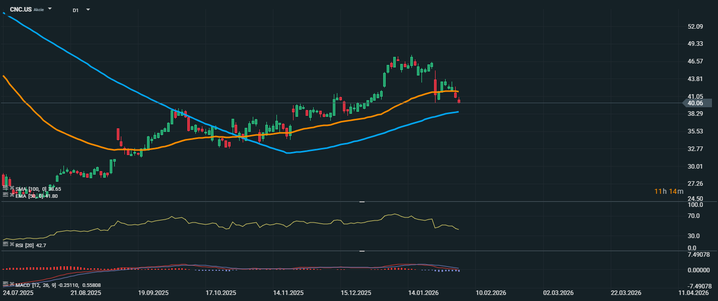 Akcie společnosti Centene se po několikaměsíčním růstu začaly obchodovat pod tlakem. Aktuálně se cena nachází na úrovni 40,06 USD a prorazila pod klouzavý průměr EMA 50 (41,80 USD), což je první varovný signál pro býky. Nadále se však drží nad SMA 100 (38,65 USD), což představuje potenciální technickou podporu. RSI dosahuje hodnoty 42,7, tedy se blíží pásmu přeprodanosti, ale ještě jej nedosáhl. To naznačuje slábnoucí nákupní momentum bez jednoznačného obratu trendu. Technicky je klíčové sledovat, zda cena najde oporu u SMA 100. Jeho proražení by mohlo otevřít prostor k poklesu směrem ke zóně 35–36 USD, zatímco návrat nad EMA 50 by naopak obnovil pozitivní sentiment.