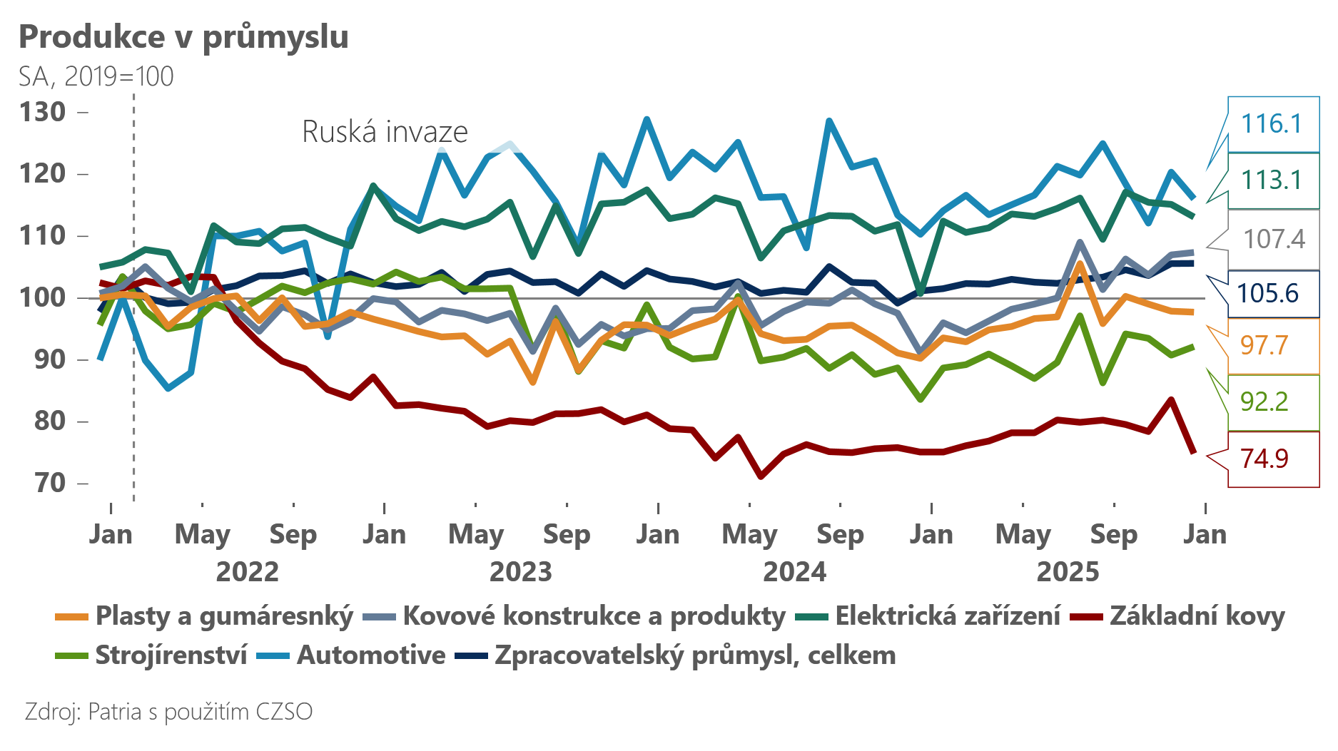 Český průmysl rostl v prosinci o 3,8 % meziročně (0,4 % meziměsíčně) – což je lehce nad naším odhadem i odhadem trhu. Na druhé straně růst zůstává značně nerovnoměrný. Ke konci uplynulého roku táhly průmysl zejména producenti kovových výrobků, elektrických zařízení a konečně i strojírenství. To na druhou stranu nadále nevykazuje nijak oslnivé nárůsty nových zakázek. Na druhé straně na své mantinely jako by narážel premiant posledních let – segment automotive. Jde pravděpodobně primárně o důsledek vysokého využití výrobních kapacit, protože nové objednávky přes určité zvolnění v dynamice dál relativně slušně rostou. Zpracovatelský průmysl za celý uplynulý rok rostl o 1,4 %. V tomto roce očekáváme přes vysokou nejistotu lehké zrychlení výkonu dané primárně rostoucími domácími investicemi a lehkým pozitivním obratem v zahraniční poptávce. Celkově očekáváme růst v blízkosti 3 %. Nerovnoměrnost ve výkonu s vysokou pravděpodobností přetrvá, mohla by však být menší než v uplynulých letech. Od energeticky náročných odvětví sice neočekáváme žádné „zázraky“, zdá se však, že své „dno“ označkovaly v roce 2024 a v roce 2026 by mohly pokračovat v opatrné stabilizaci. Pomáhat jim může i startující investiční cyklus v sousedním Německu, který může podnítit poptávku po základních kovech a stavebních materiálech. V tomto kontextu by se mohlo začít dařit o něco lépe také nejcykličtějším odvětvím v čele se strojírenstvím. Na druhou stranu automotive bude mít čím dál menší manévrovací prostor zůstat jediným tahounem českého průmyslu. Přes relativně pozitivní vyhlídky samozřejmě český průmysl čelí velké řadě nejistot. Na prvním místě je to možnost opětovné eskalace obchodního napětí mezi Evropou a USA, a pak velmi ostrá konkurence z Číny vypořádávající se s nadprodukcí řady svých odvětví (včetně automotive).