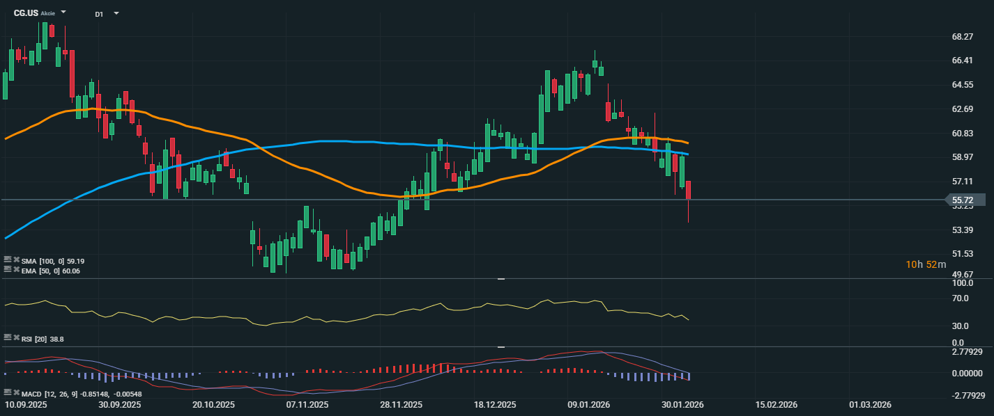 Akcie společnosti Carlyle Group v posledních dnech procházejí výrazným poklesem a aktuálně se obchodují na úrovni 55,72 USD, což představuje průraz pod klouzavé průměry EMA 50 (60,06 USD) i SMA 100 (59,19 USD). Tím došlo k potvrzení medvědího technického signálu, jelikož cena nedokázala udržet důležité úrovně podpory. RSI kleslo na hodnotu 38,8, tedy se přibližuje pásmu přeprodanosti, což může naznačovat možnost krátkodobé konsolidace či technického odrazu. Z technického hlediska je důležité sledovat, zda se cena udrží nad hladinou 55 USD, kde se nachází krátkodobá horizontální podpora. Případné prolomení by mohlo otevřít prostor pro další pokles až k úrovním kolem 52–53 USD. Naopak návrat nad SMA 100 by mohl obnovit pozitivní výhled.