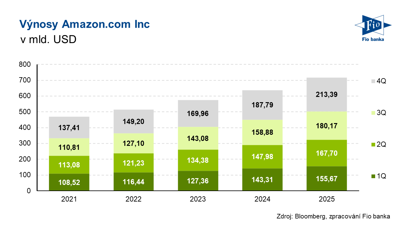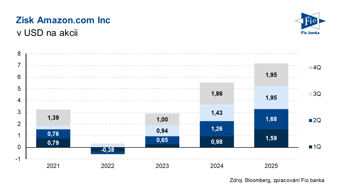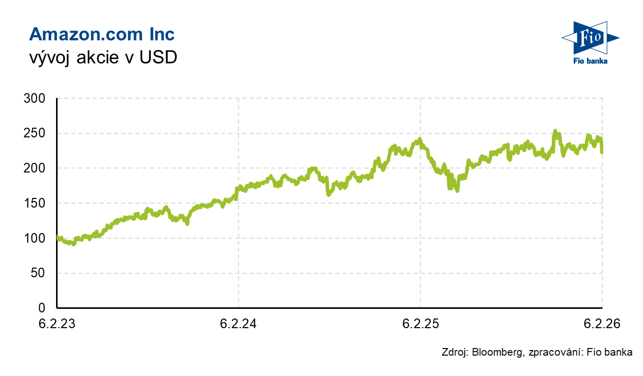 Klíčová slova: Akcie | Bloomberg | CEO | Dividendový výnos | Investice | Marže | P/E | Ukazatel | Výnos | Wall Street | Zisk na akcii | Analytici | USD | Zisk | Výsledky | EPS | Akcie Amazon | Banka | Fio banka | Capital Markets | Cena | Fio | Markets | Trh | ROIC | Cílová cena | Provozní marže | ROCE | RBC Capital Markets | Evercore ISI | RBC Capital | Hospodářské výsledky | Přehled | Kapitalizace | Výhled | Konsensus | Výnosy | Očekávání | Amazon (AMZN) | AMZN | Kapitálové výdaje | Pohyb měnových párů | Čistý zisk | Generální ředitel | Amazon | Problémy | Ziskovost | Návratnost | Analytička | Solidní výsledky | Pokles | Provozní zisk | Meziroční růst | Obchody | Výdaje | FCF | Vývoj | Růst | Akcie Amazon (AMZN) | Růst výnosů | JDE | Akcie Amazon.com | Prodej | Starlink | Andy Jassy | AI | Divize | SpaceX | Společnosti | RBC | Společnost | Výsledky společnosti | 3М | Motley Fool | Pozitivní výsledky | Vital Knowledge | Znehodnocení | Vice | Evercore | AWS | Capital | Cloudové služby | Služby | Fio banka, a.s. | The Motley Fool | Michal Bárta | Náklady | Truist Securities | Volné hotovostní toky | Hotovostní toky | Kuiper | Amerika | Cloudové infrastruktury | SHOP | Čipy | Rok 2026 |
