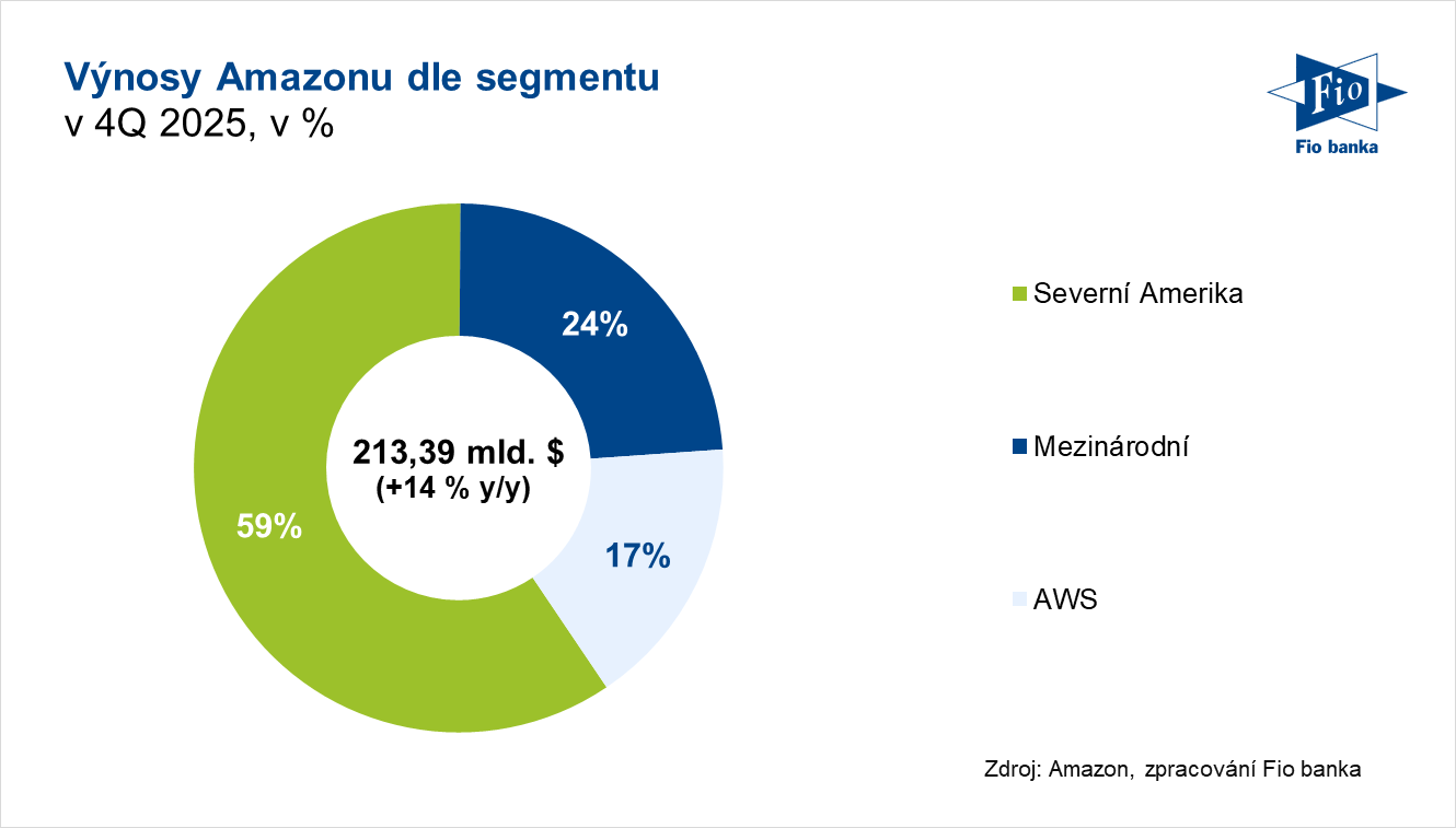 Americký e-shop a poskytovatel cloudové infrastruktury Amazon zveřejnil své hospodářské výsledky za čtvrtý kvartál roku 2025. Růst klíčového segmentu AWS zrychlil na 24 % meziročně, čímž překonal analytická očekávání (+21 %). Společnost zveřejnila výhled pro 1Q, který podle analytiků zaostal za očekáváním v provozním zisku. Amazon letos plánuje vynaložit na kapitálové výdaje 200 mld. USD, což výrazně překonalo analytická očekávání (146,11 mld. USD) a vzbuzuje mezi investory obavy ohledně návratnosti.
