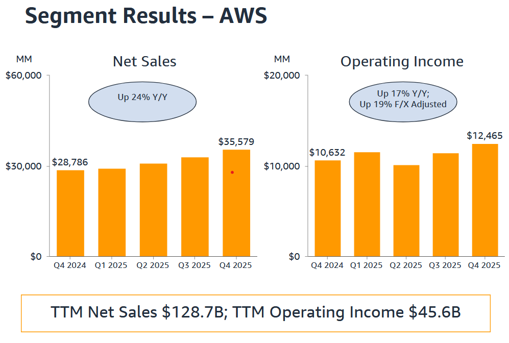 AWS překonalo ve 4Q očekávání, když zrychlilo růst výnosů na meziročních +24 % na 35,58 mld. USD. Jedná se o největší meziroční růst za více než tři roky. Provozní zisk tohoto segmentu dosáhl 12,47 mld. USD (4Q 2024: 10,63 mld. USD) a tvořil téměř 50 % provozního zisku celé společnosti. Provozní marže vzrostla meziročně o 40 bazických bodů na 35 %.