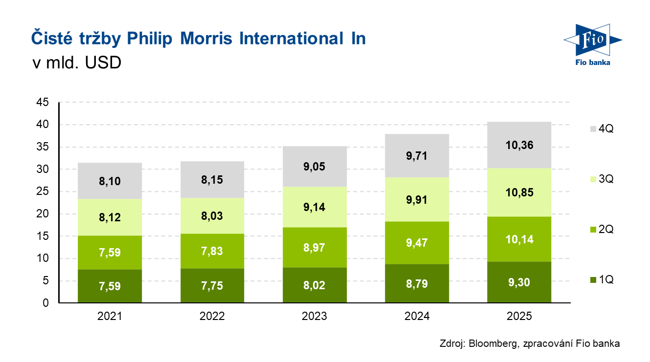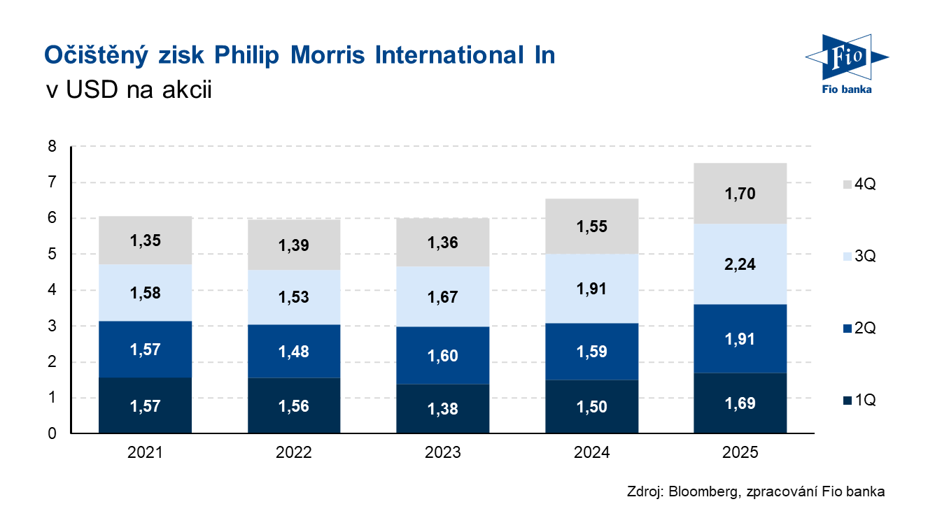 Americká tabáková skupina Philip Morris International zveřejnila výsledky hospodaření za čtvrté čtvrtletí roku 2025. Firma zároveň zveřejnila výhled pro rok 2026, kdy očekává očištěný zisk na akcii 8,38–8,53 USD, tedy nad odhady analytiků (konsensus 8,31 USD).