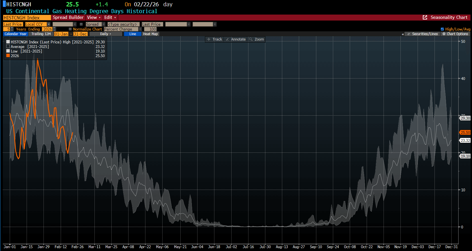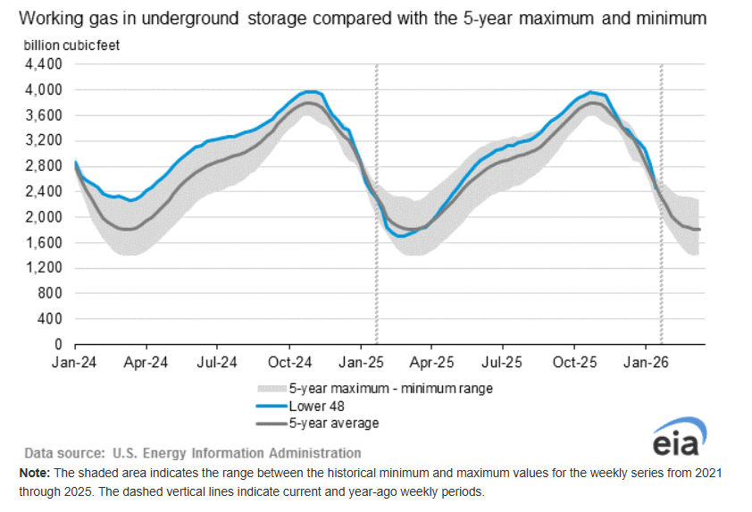 - Změna předpovědi počasí: Po lednové arktické vlně nyní meteorologické modely naznačují oteplovací trend v klíčových regionech USA (například na středozápadě a severovýchodě), což omezuje spotřebu plynu pro vytápění.