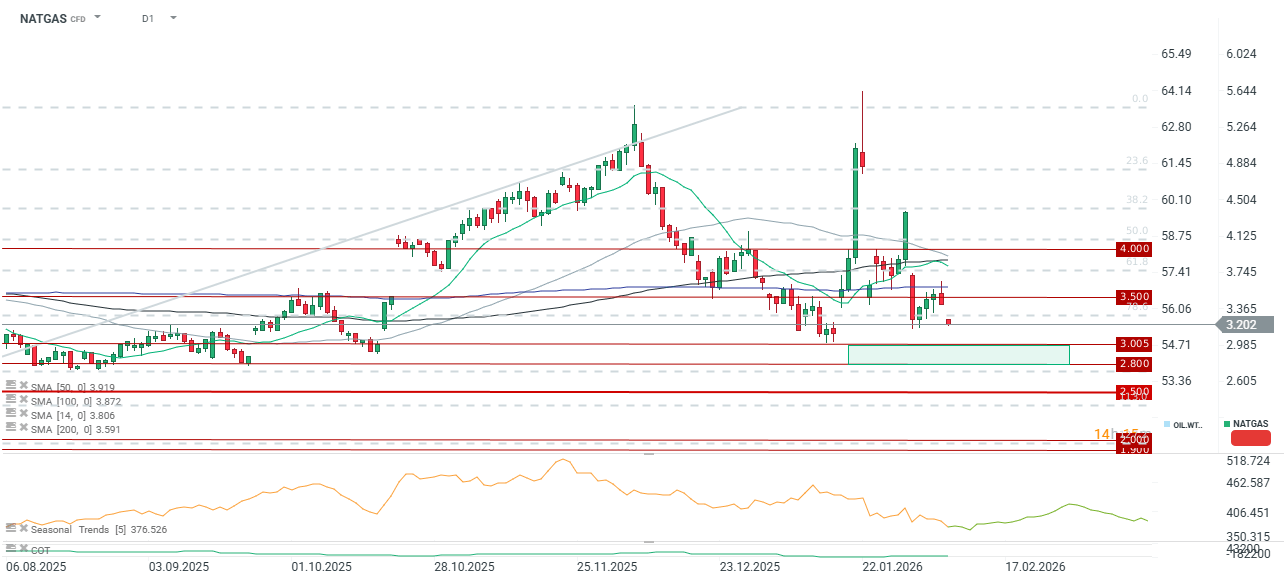 Ceny zemního plynu na začátku nového týdne poklesly o více než 6 %. Oproti pátečnímu maximu cena nyní klesla až o 12 %. Trhy v současné době testují úroveň 3,2 USD/MMBtu, což představuje lokální minima z počátku minulého týdne. Pokud by tato podpora byla prolomena, ceny by dosáhly nejnižší úrovně od poloviny ledna, s potenciálem poklesu směrem k významné poptávkové zóně kolem 2,8–3,0 USD/MMBtu.