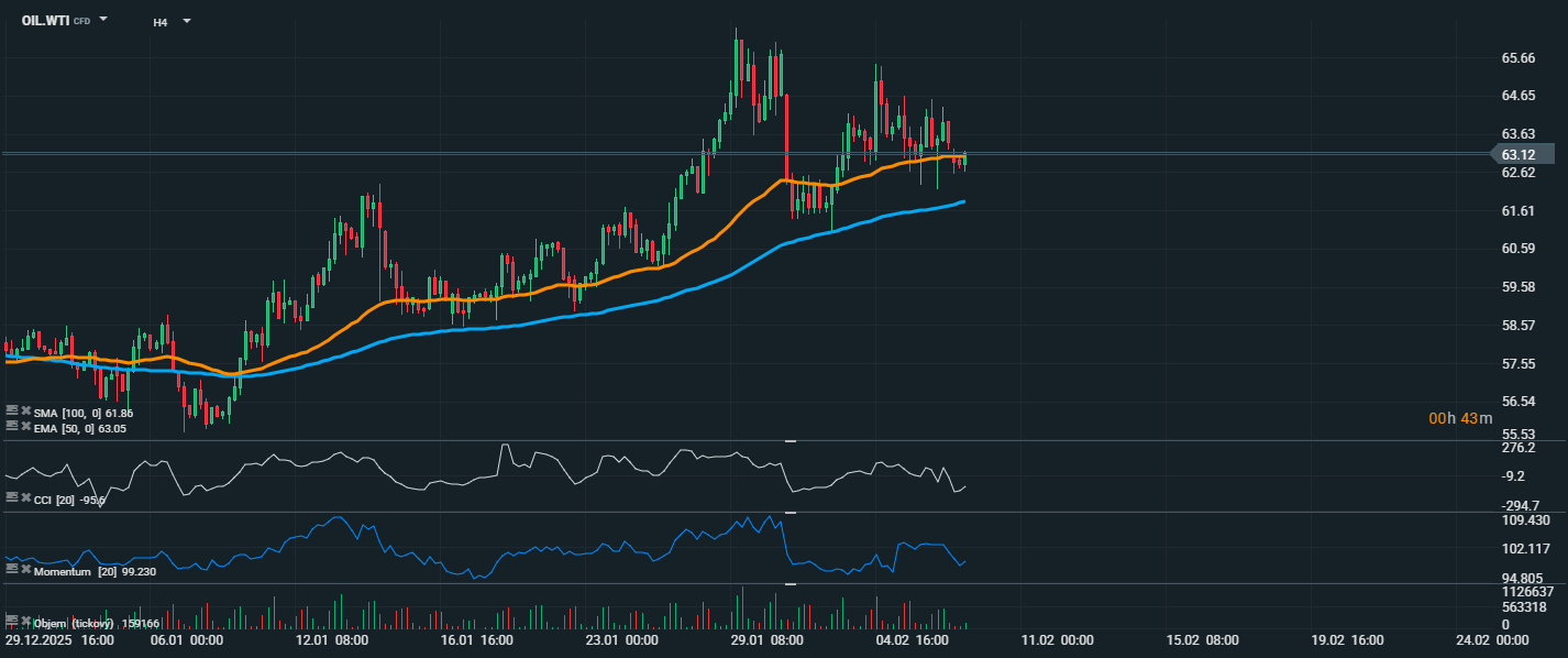 Cena ropy WTI se po předchozím růstu dostala do krátkodobé konsolidace a aktuálně se obchoduje kolem úrovně 63,12 USD. Cena se nyní pohybuje v těsné blízkosti klouzavého průměru EMA 50 (63,05 USD), zatímco SMA 100 (61,86 USD) zůstává níže a nadále plní roli střednědobé podpory. CCI se nachází na hodnotě -95,6, což signalizuje přechod do negativního pásma a potvrzuje ochlazení býčího momenta. Momentum (99,23) se drží mírně pod neutrální hranicí 100, což ukazuje na slábnoucí nákupní sílu, nikoli však na výrazný obrat trendu. Objemové svíčky nenaznačují panický výprodej, spíše postupné uklidnění trhu. Z technického pohledu zůstává struktura trhu stále pozitivní, dokud se cena drží nad oblastí 61,80–62,00 USD, kde se nachází SMA 100 i předchozí cenová struktura. Průraz pod tuto zónu by mohl otevřít prostor pro hlubší korekci. Naopak návrat nad 63,60–64,00 USD by znamenal obnovení růstového impulzu a snahu znovu otestovat lokální maxima.