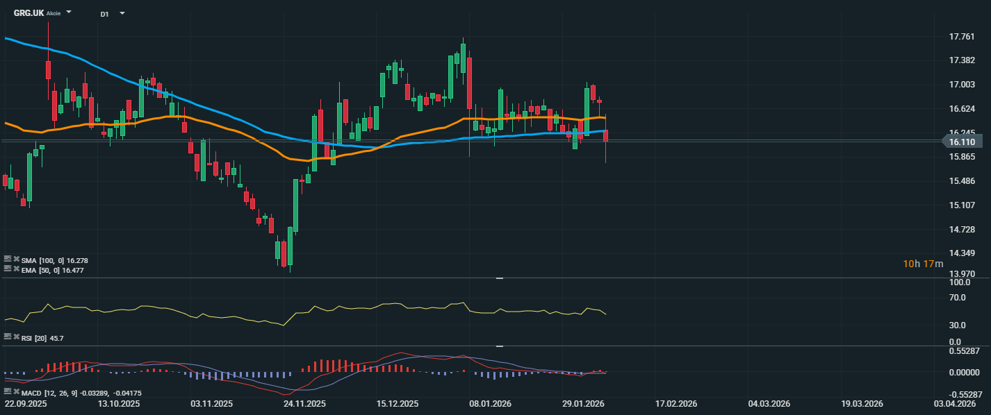 Akcie Greggs se dostávají pod výraznější prodejní tlak a aktuálně se obchodují kolem úrovně 16,11 GBP, kde zároveň testují klíčovou oblast klouzavých průměrů. Cena se nachází pod EMA 50 (16,48 GBP) a velmi blízko SMA 100 (16,28 GBP), což ukazuje na ztrátu krátkodobého růstového momenta a zvýšené riziko dalšího oslabení. RSI na hodnotě 45,7 se pohybuje pod neutrální hranicí 50, což potvrzuje převahu prodejců, ale zatím nenaznačuje přeprodaný stav. Z technického hlediska je nyní zásadní udržení podpory v pásmu 15,85–15,90 GBP. Její proražení by mohlo otevřít prostor k hlubší korekci směrem k 15,50 GBP, případně až k lokálním minimům z listopadu. Naopak návrat nad 16,50 GBP a následné proražení EMA 50 by byl prvním signálem stabilizace a možného pokusu o obrat trendu.