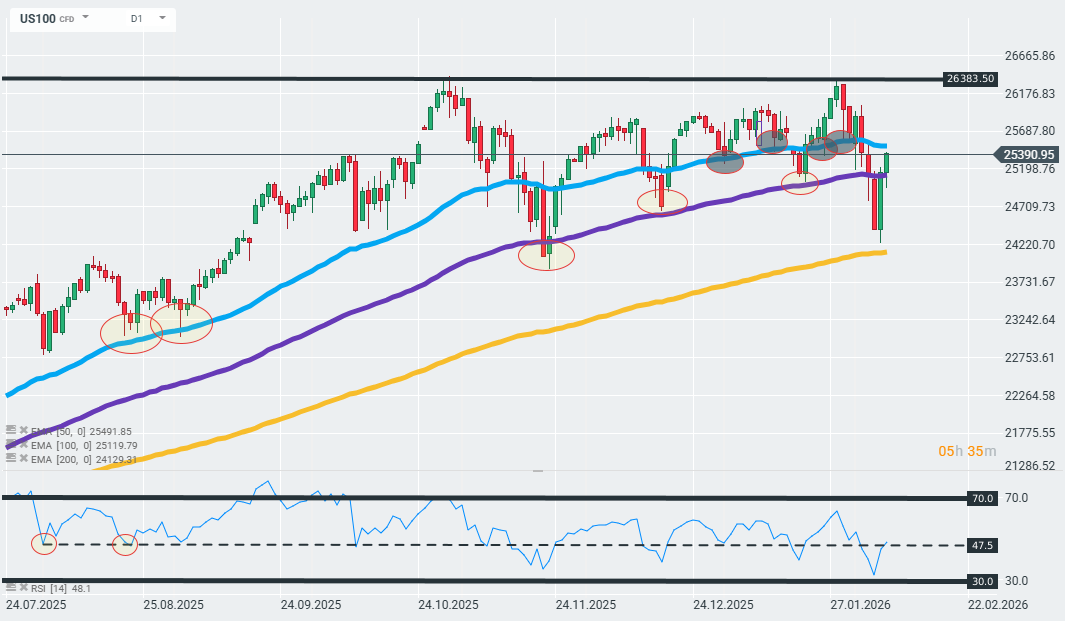 US100 změnil svůj výhled v reakci na dění při otevření Wall Street. Růst zrychlil a index se aktuálně dokázal dostat nad 100denní EMA (fialová křivka), která na grafu opakovaně představovala klíčovou úroveň podpory pro růstový trend. Čím déle se cena udrží nad touto bariérou, tím vyšší je pravděpodobnost pokračování celkového uptrendu.