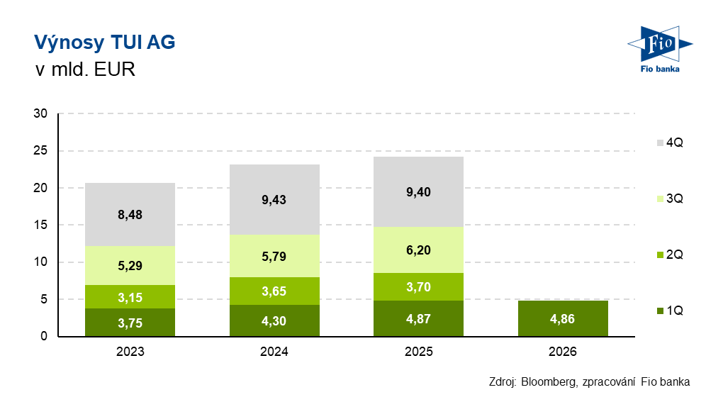 Německá cestovní společnost TUI AG zveřejnila výsledky hospodaření za fiskální rok 2025 a výhled na rok 2026. Výnosy dosáhly za uplynulý rok 24,18 mld. EUR při průměrném očekávání 24,28 mld. EUR. Na následující rok projektuje růst výnosů o 2-4 % a očištěného zisku EBIT o 7-10 %. Dle analytika ze společnosti Bernstein je výhled mírně pod odhady, což může být způsobeno konzervativním přístupem společnosti. -