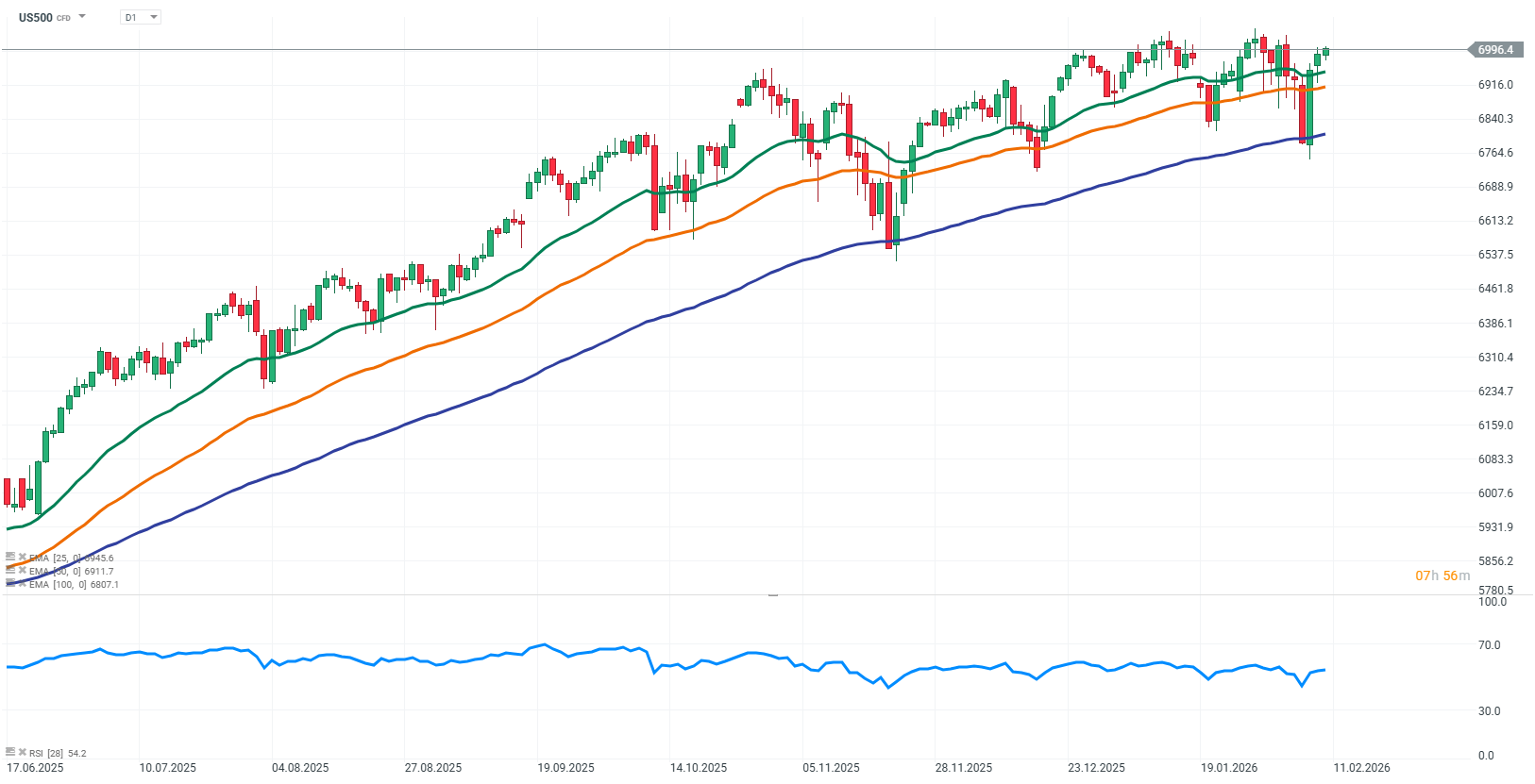 Futures na US500 (S&P 500) jsou v dnešní seanci mírně výše. Pozitivní sentiment v technologickém sektoru podporuje ocenění akcií navzdory slabším než očekávaným datům o maloobchodních tržbách. Pomalejší růst spotřebitelských výdajů může zvýšit šance na uvolněnější politiku Fedu, což dále pomáhá udržet pozitivní náladu na trhu.