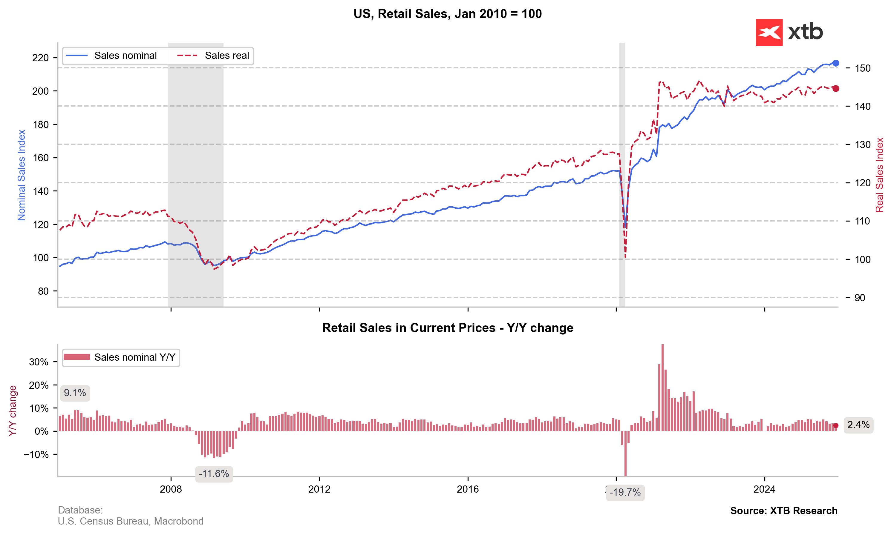 Z makroekonomického pohledu byla právě zveřejněna data o amerických maloobchodních tržbách za prosinec, která výrazně zaostala za očekáváním. Mezimesačně tržby stagnovaly a tzv. „jádrová“ složka, očištěná o prodeje automobilů, rovněž nevykázala žádný růst. To naznačuje možné zpomalení spotřebitelských výdajů, které by mohlo omezit ekonomickou dynamiku a snížit inflační tlaky tažené poptávkou. Zároveň rostou mzdové náklady, avšak pomalejším tempem, než se očekávalo, což dále zmírňuje riziko nadměrného růstu cen. Slabá spotřebitelská data v kombinaci se současnými ukazateli naznačují, že inflace by mohla dále klesat, což zvyšuje pravděpodobnost, že Federální rezervní systém zaujme holubičí postoj s možností budoucího snižování úrokových sazeb.