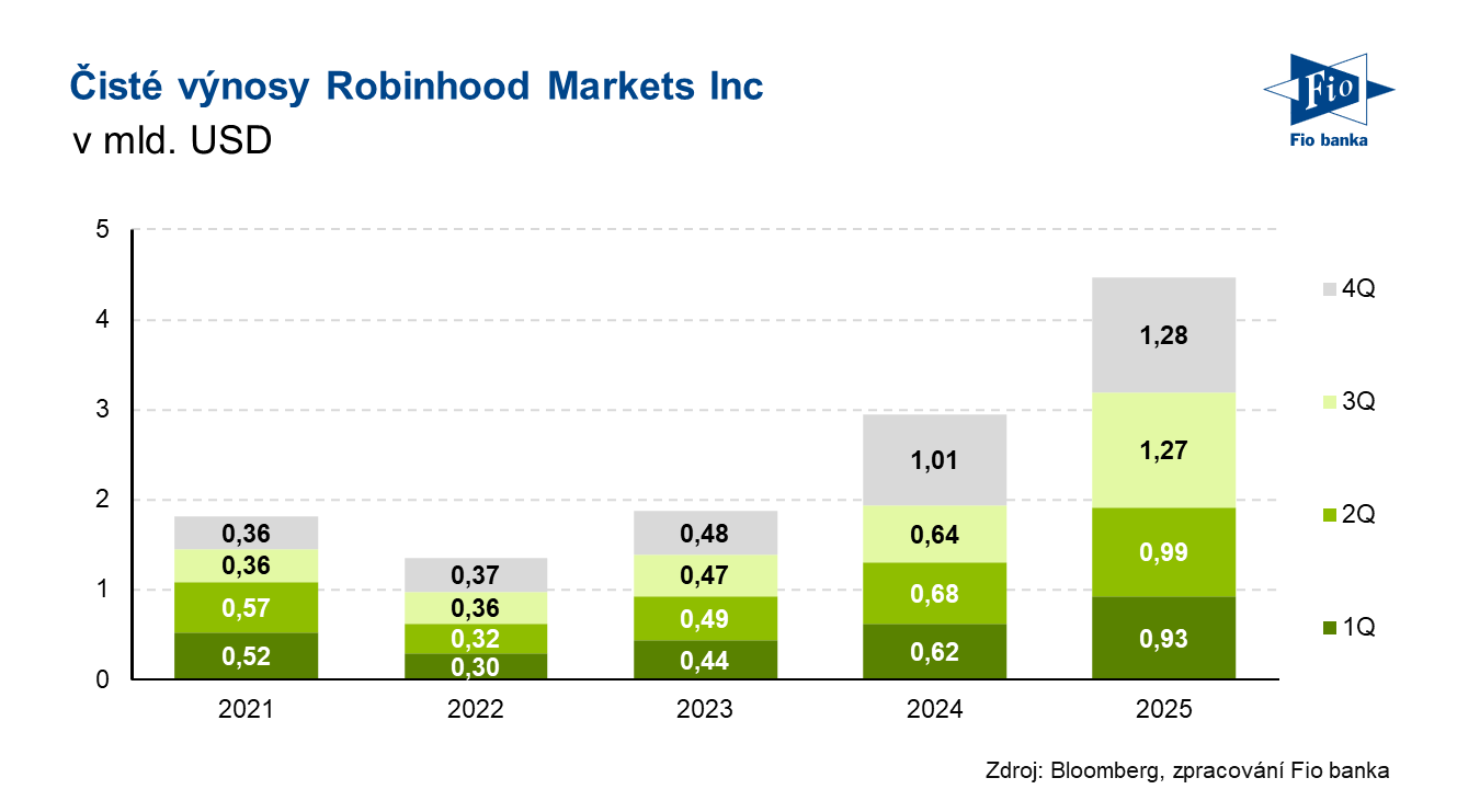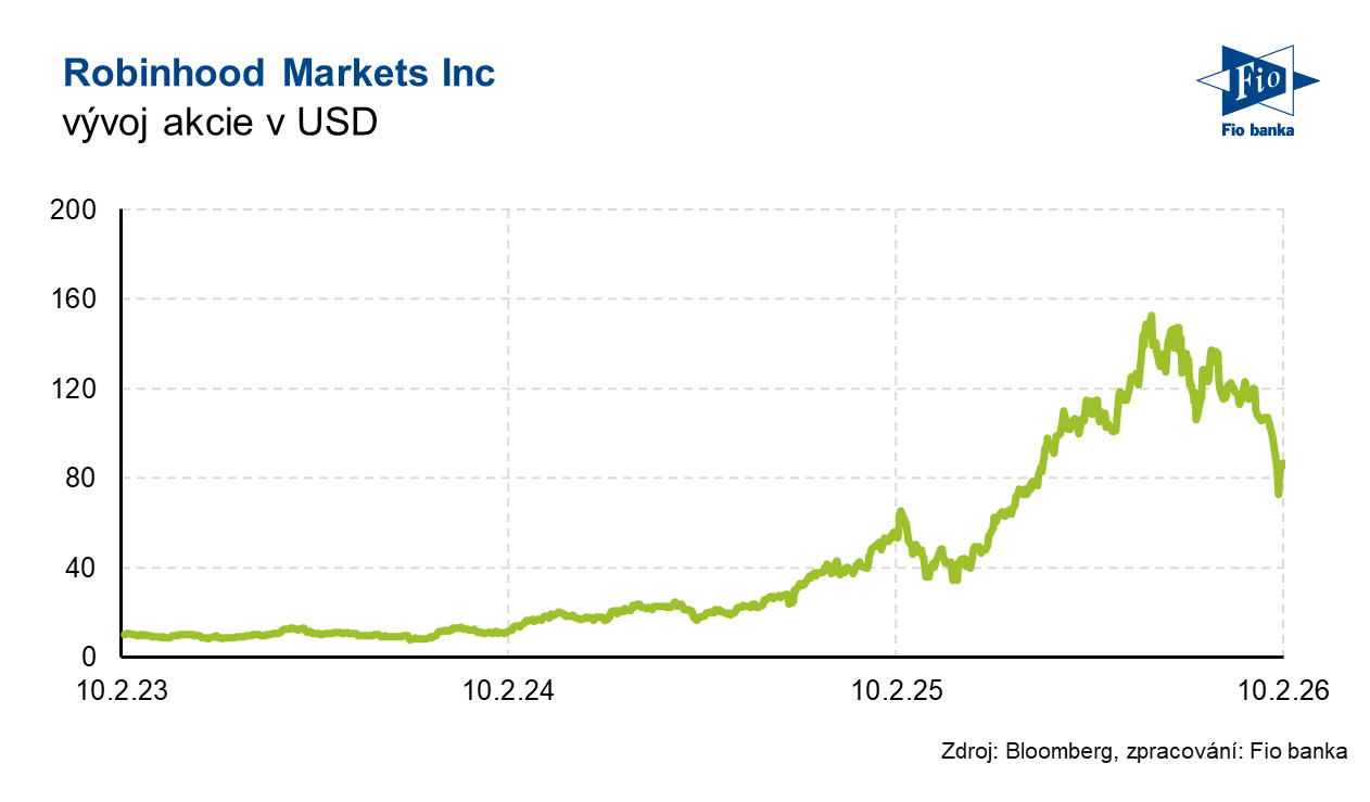 Klíčová slova: Finance | Analytik | Akcie | Bloomberg | Dividendový výnos | P/E | Trend | Ukazatel | Výnos | Zisk na akcii | Analytici | USD | JPMorgan | Zisk | Výsledky | Gold | EPS | Banka | Fio banka | Cena | Cena akcií | Fio | Markets | Trh | Výprodej | Cílová cena | EBITDA | ROCE | Podnikání | Kryptoměny | Kapitalizace | Výhled | Konsensus | Výnosy | Očekávání | Robinhood | FinTech | Akcie společnosti | Čistý zisk | Objem | Generální ředitel | Fintech společnost | Podnik | Pokles | Počet zákazníků | Zisk EBITDA | Finanční ředitel | Meziroční růst | Vývoj | Viceprezident | Růst | Poradce | Průměrný výnos | Expanze | Bloomberg Intelligence | Vývoj akcie | Robinhood Markets | Vlad Tenev | Silný růst | Konsensus trhu | HOOD | Společný podnik | Akcie Robinhood Markets | Akcie Robinhood | Čisté úrokové výnosy | Úrokové výnosy | Provozní náklady | Společnosti | Společnost Robinhood | Odkupy akcií | Společnost | Výsledky společnosti | 3М | Půjčování cenných papírů | Monetizace | Zpětné odkupy | Vklady | Vice | Komentář vedení | Nadšení | Průměrný denní objem | Denní objem | Služby | Fio banka, a.s. | Rok 2025 | Michal Bárta | Odměny | Náklady | Group | Susquehanna | Rok 2026 |