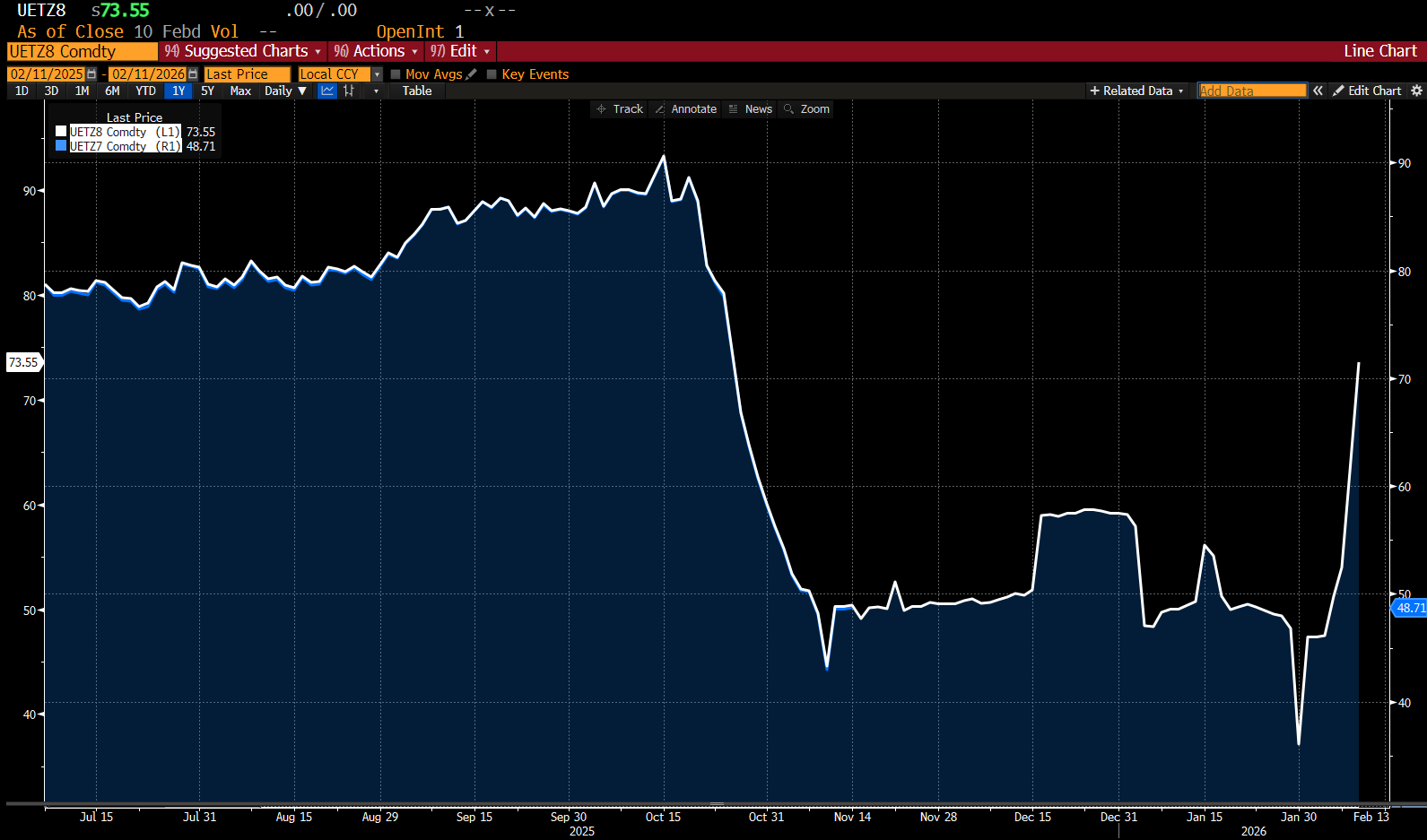 Ceny emisních povolenek pro domácnosti – EU ETS2 – začaly v tomto týdnu výrazně narůstat. Termínový kontrakt na ně s termínem vypořádání v roce 2028 se na burze v Lipsku včera přehoupl přes 70 eur za kus (viz graf agentury Bloomberg níže). Jedná se o nejvyšší uzavírací cenu od koce loňského října, kdy cena povolenek začala klesat kvůli údajnému zastropování. V tomto týdnu tak povolenka zdražila o zhruba 45 procent.