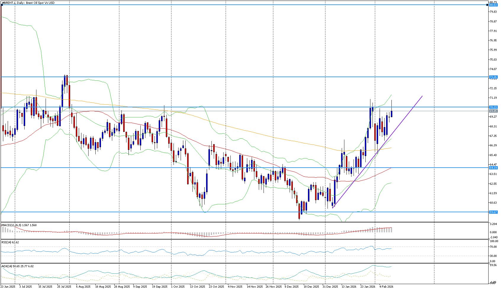 Cena ropy BRENT se postupně zvedá a zapisuje třetí růstovou seanci během posledních čtyř obchodních dnů. Trh se znovu přibližuje k psychologické hranici 70,00 USD za barel, která v posledních týdnech funguje jako horní okraj konsolidačního pásma 67,00–70,00. Od začátku února se ceny pohybují převážně v tomto rozmezí, přičemž krátkodobá vzestupná trendová linie vedená od počátku roku 2026 nadále poskytuje technickou oporu. Fundamentální podporu zajišťuje pokračující geopolitické napětí na Blízkém východě. Prohlášení amerického prezidenta Donalda Trumpa o možnosti vyslání druhé letadlové lodi do regionu, pokud nedojde k pokroku v jednáních s Íránem, zvýšilo obavy z potenciální eskalace. Trh tak zůstává citlivý na jakékoli zprávy týkající se vývoje vztahů mezi USA a Íránem, což podporuje rizikovou prémii v ceně ropy. Technický obraz zůstává konstruktivní. Indikátor ADX se drží výrazně nad úrovní 30 a linie DI+ převyšuje DI-, což signalizuje sílu aktuálního trendu. RSI stoupá nad 60 bodů a směřuje k překoupené oblasti, zatímco MACD se pohybuje v pozitivním teritoriu poblíž své signální linie. To naznačuje, že býčí momentum přetrvává, i když se blíží k potenciálně citlivým úrovním. Pokud se ropě podaří udržet nad 70,00 a tuto bariéru přesvědčivě prolomit, další rezistence se nachází u horního Bollingerova pásma kolem 71,57. V opačném případě by případná korekce mohla nejprve zamířit k oblasti 66,50–67,00, kde se sbíhají 20denní a 200denní SMA spolu s rostoucí trendovou linií. Níže pak leží další významná podpora kolem 64,00, podpořená 50denním a 100denním klouzavým průměrem. Celkově zůstává výhled mírně pozitivní, pokud geopolitické riziko přetrvá.