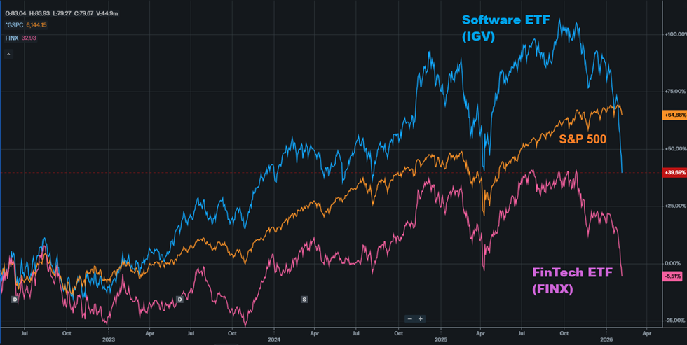 Ale pod povrchem v některých sektorech nyní dochází k velmi silným výprodejům, a to v sektorech finančních technologií (fintech) a software. Obzvlášť softwarový sektor je nyní pod velkým tlakem vlivem obav investorů z inovací v oblasti umělé inteligence, která by mohla významným způsobem narušit fungování i těch největších společností v sektoru. Je tento strach přehnaný, nebo AI modely skutečně nahradí velkou část placených služeb, které softwarové společnosti dnes nabízí?