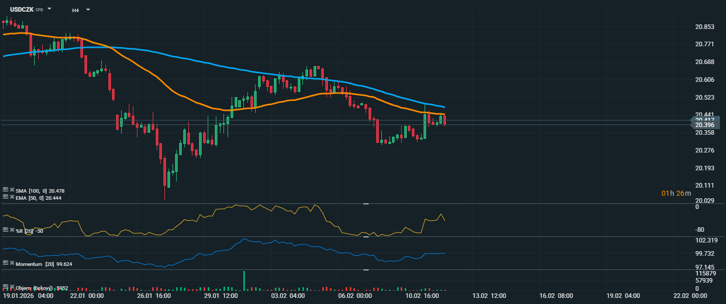 Měnový pár USDCZK se aktuálně obchoduje v blízkosti úrovně 20,41 CZK za dolar a nadále se nachází pod hlavními klouzavými průměry. Cena se drží pod EMA 50 (20,44) i pod SMA 100 (20,48), což potvrzuje pokračující krátkodobý medvědí trend. Každý pokus o růst je zatím limitován právě těmito dynamickými rezistencemi. V předchozích dnech došlo k výraznějšímu poklesu směrem k oblasti 20,30, odkud se kurz odrazil a vytvořil mírnou korekci. Tento růst však zatím působí spíše jako technický pullback než jako začátek nového rostoucího trendu. Struktura nižších maxim zůstává zachována. RSI se pohybuje v neutrálním pásmu a postupně roste, což naznačuje určité zlepšení momenta, avšak bez vstupu do překoupené oblasti. Momentum rovněž mírně posiluje, ale stále nepřináší jasný signál obratu. Objem obchodů zůstává relativně utlumený, což naznačuje vyčkávací postoj trhu.