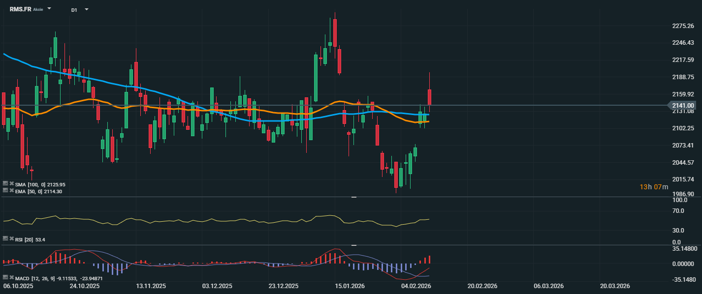 Akcie společnosti Hermès se aktuálně obchodují v blízkosti 2 141 EUR a po předchozí korekci se snaží stabilizovat. Cena se pohybuje těsně nad EMA 50 (2 114 EUR), zatímco SMA 100 (2 126 EUR) představuje blízkou technickou bariéru. Po výrazném lednovém růstu směrem k oblasti 2 275 EUR následovala prudší korekce, která stlačila cenu pod 2 000 EUR. Následný odraz však ukazuje na návrat kupců a postupné budování vyšších minim. Aktuální cenový vývoj naznačuje pokus o vytvoření krátkodobého dna. RSI se nachází kolem hodnoty 53, tedy v neutrální zóně, s mírně rostoucí tendencí, což potvrzuje zlepšující se momentum bez známek překoupenosti.