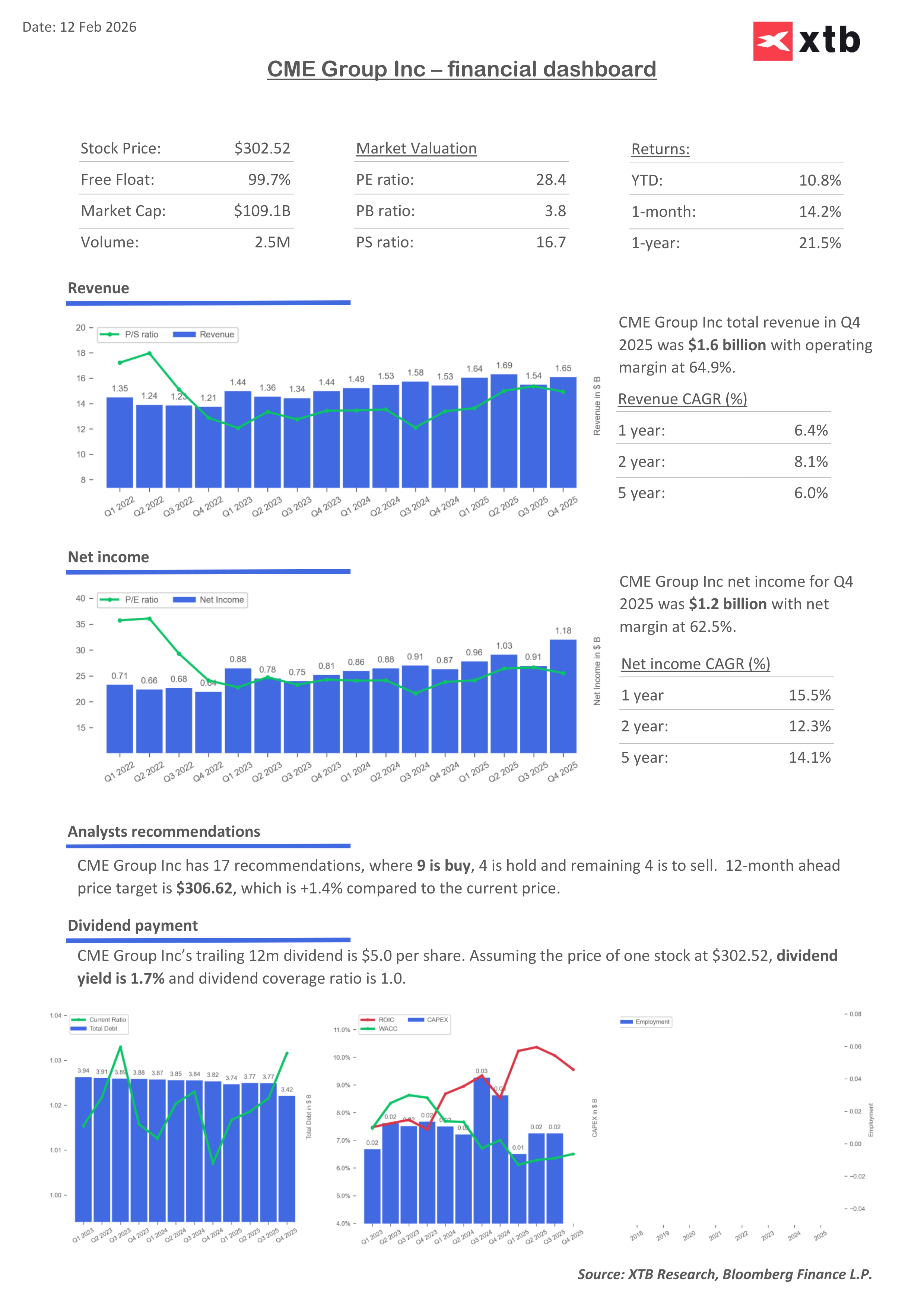 Ocenění společnosti CME měřené standardním ukazatelem P/E se nezdá být přehnané (P/E kolem 28, forward P/E 25), a to s ohledem na vysoké marže, relativně silnou předvídatelnost růstu a určitou „odolnost“ podnikání. Společnost totiž generuje zisky především z objemů obchodování, nikoli ze směru indexů či cenových pohybů jednotlivých aktiv.