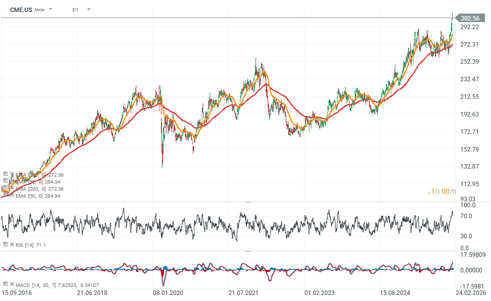 Akcie CME Group (CME.US) se aktuálně obchodují na historickém maximu, blízko 300 USD za akcii, a od začátku roku posílily o více než 10 %, a to navzdory smíšenému vývoji na Wall Street. Titul podporuje silná institucionální účast na trhu, rostoucí systémový význam burzy a nové produkty s potenciálem zrychlit růst tržeb.